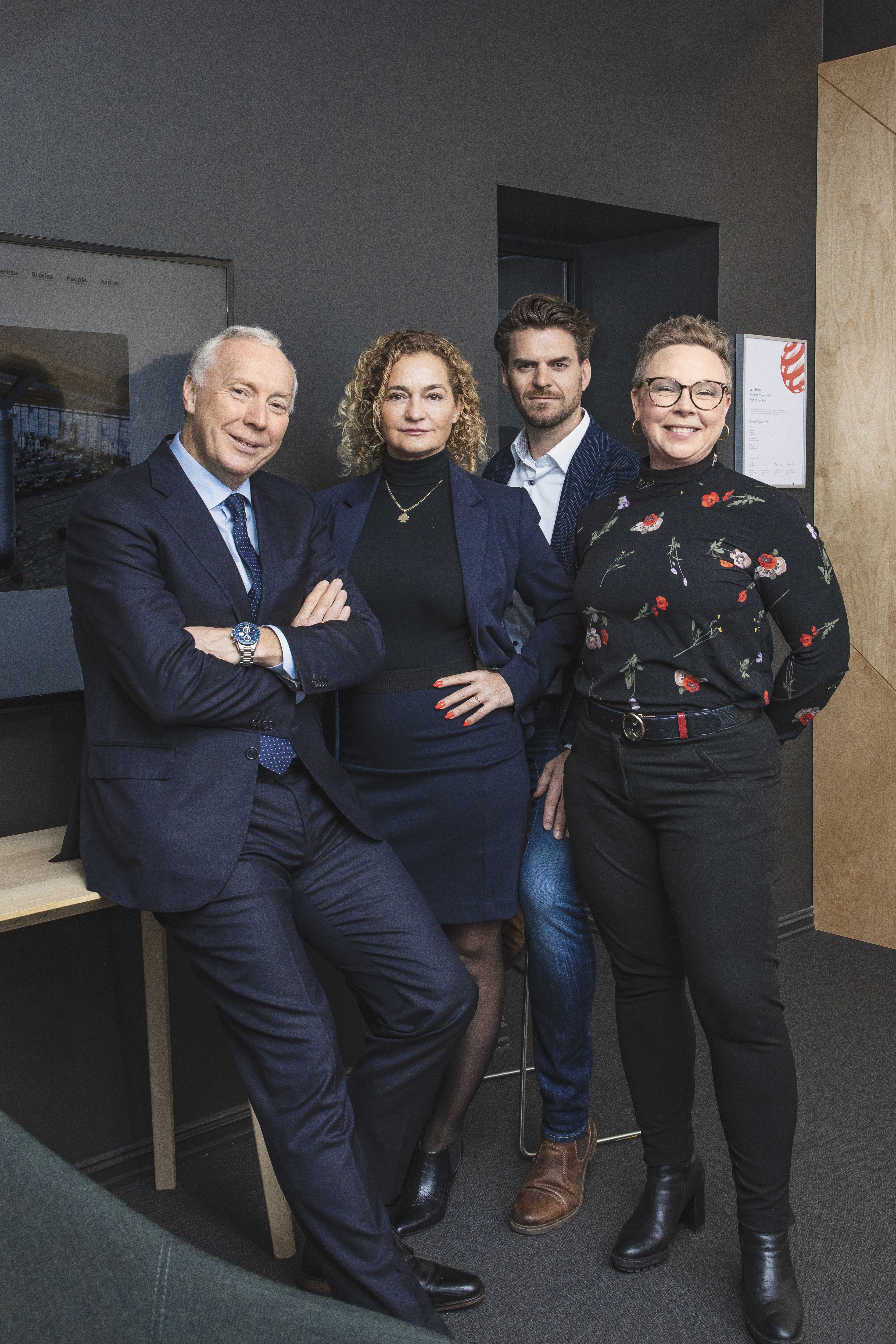 STØRST. Ved å gå sammen skaper Sopra Steria og EGGS Design det største design- og innovasjonsmiljøet i Skandinavia. På bildet, f.v.: administrerende direktør Kjell Rusti i Sopra Steria, administrerende direktør Ulla Sommerfelt i EGGS Design, Chief Experience Officer Paal Holter i EGGS Design og Anette Urhamar, direktør for området Xperience i Sopra Steria. Foto: Sopra Steria