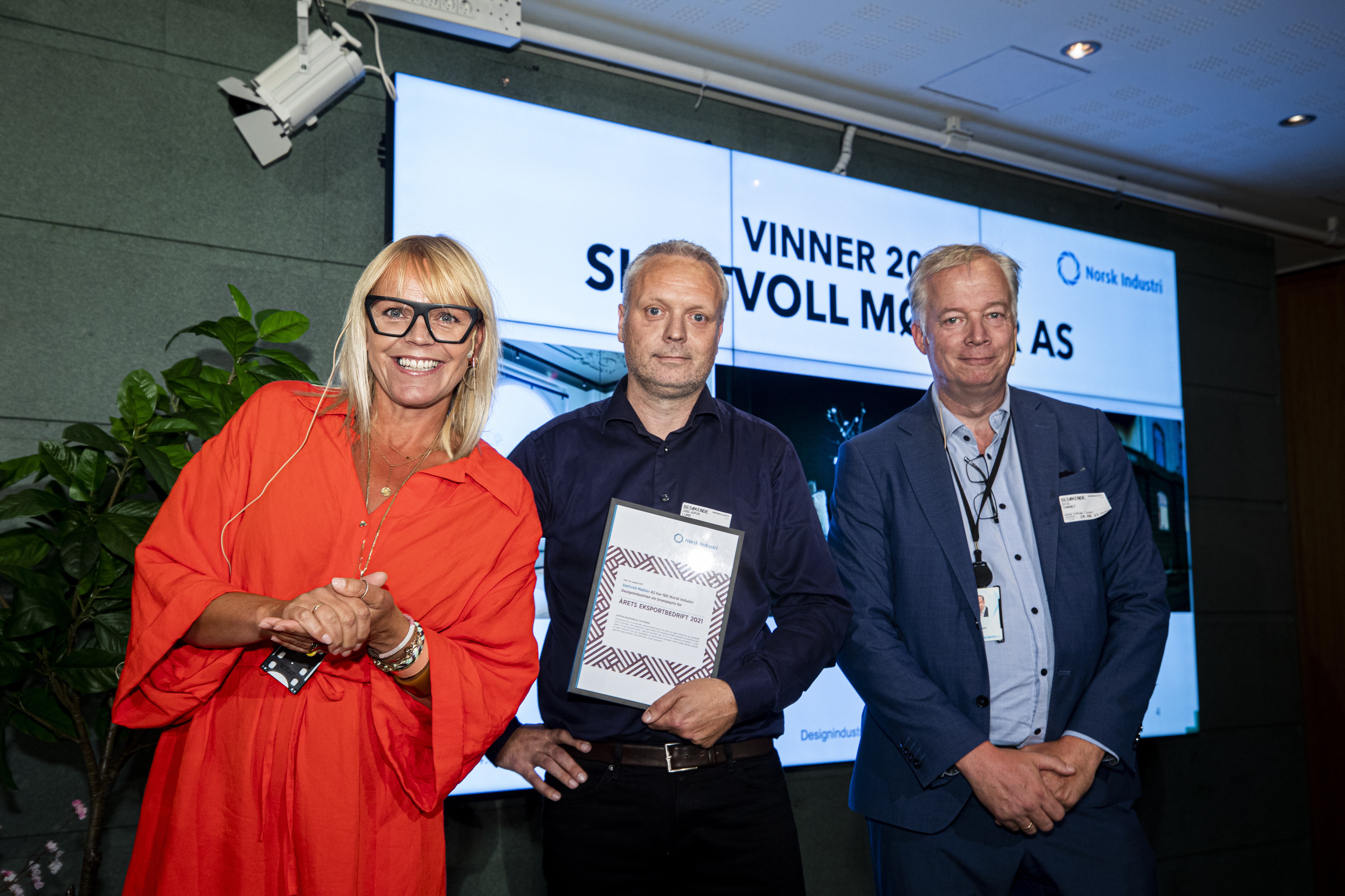 ÅRETS EKSPORTØR. Salgssjef Odd-Erik Lund (i midten) har nettopp mottatt pris for årets eksportbedrift på vegne av Slettvoll Møbler. Her flankeres han av markedssjef Ragnhild Grytten og bransjesjef Egil Sundet fra Designindustrien. Foto: Thomas Bjørnflaten / Nye Bilder