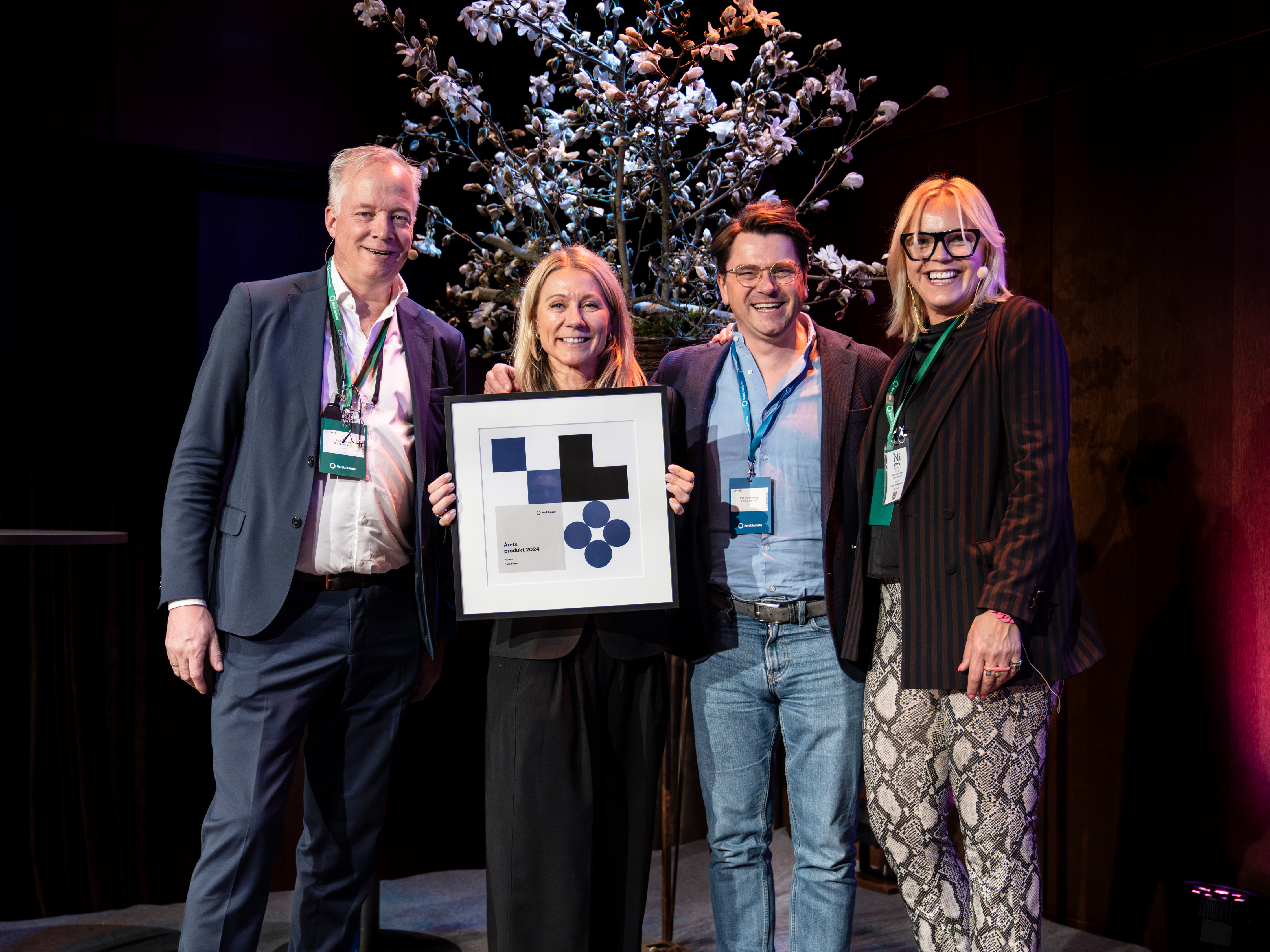 ÅRETS PRODUKT. Fora Form mottok prisen Årets produkt for stolen Atrium. Her har Heidi Niss og Pål Eid-Hviding (i midten) nettopp fått prisen fra Egil Sundet og Ragnhild Grytten i Norsk Industri Designindustrien. Foto: Melissa Hegge