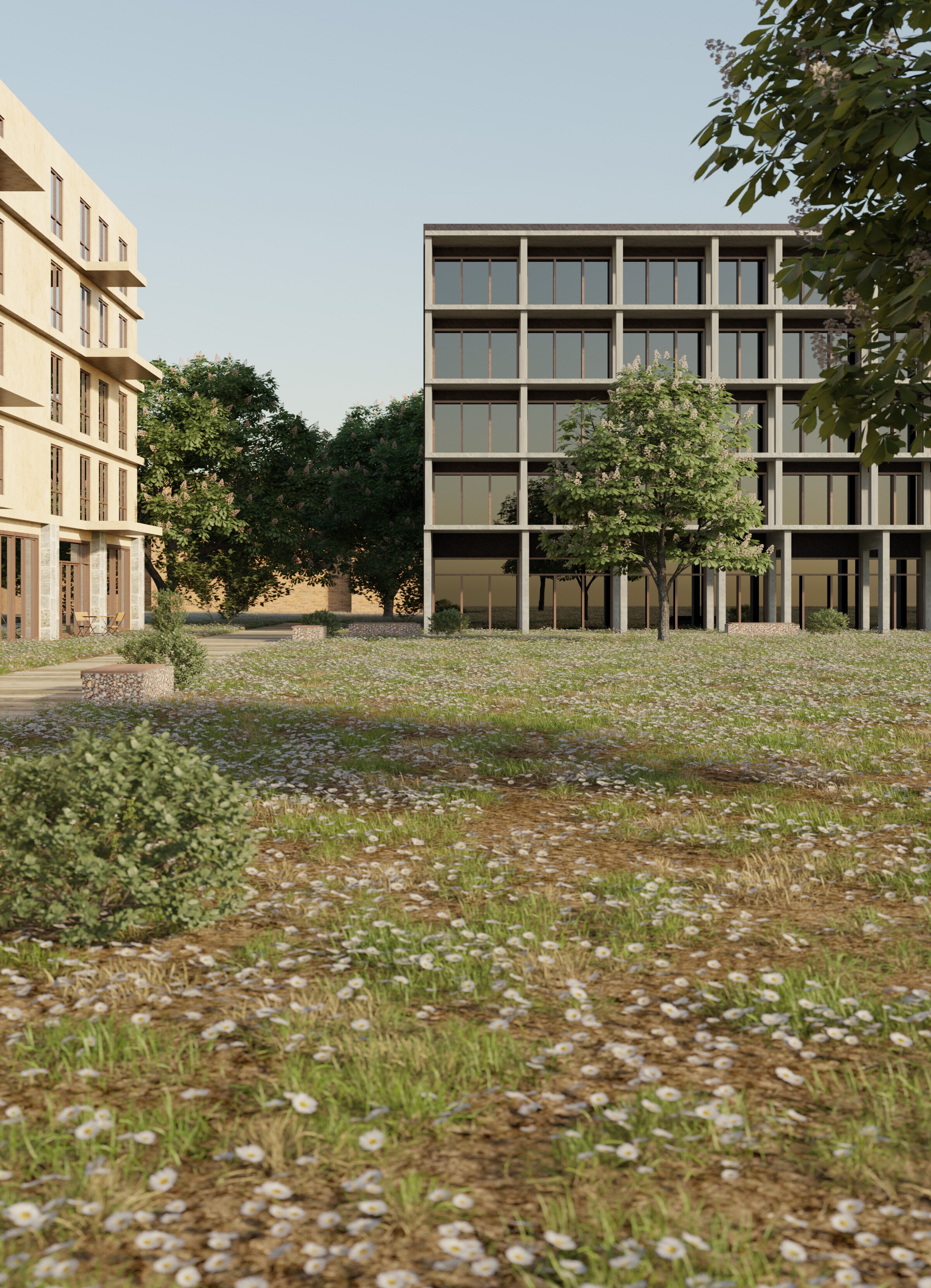 Ved å videreføre deler av ruinene i nye bygg, anerkjennes minner og tap, uten å gjøre ødeleggelsen til kulisse. Kontrasten mellom grove, gjenbrukte materialer og lette, nye konstruksjoner brukes bevisst for å skape trygge og verdige hverdagsmiljøer.