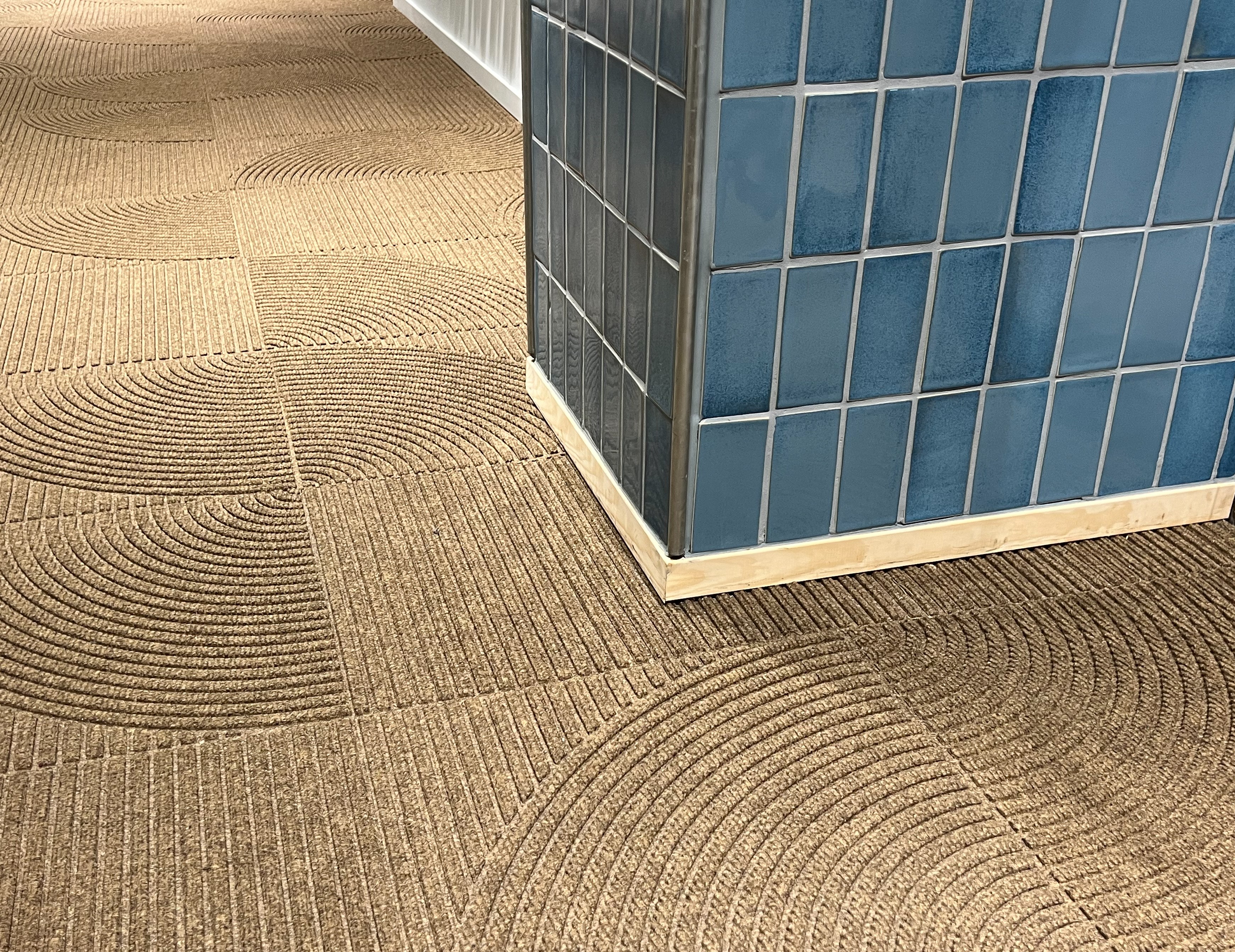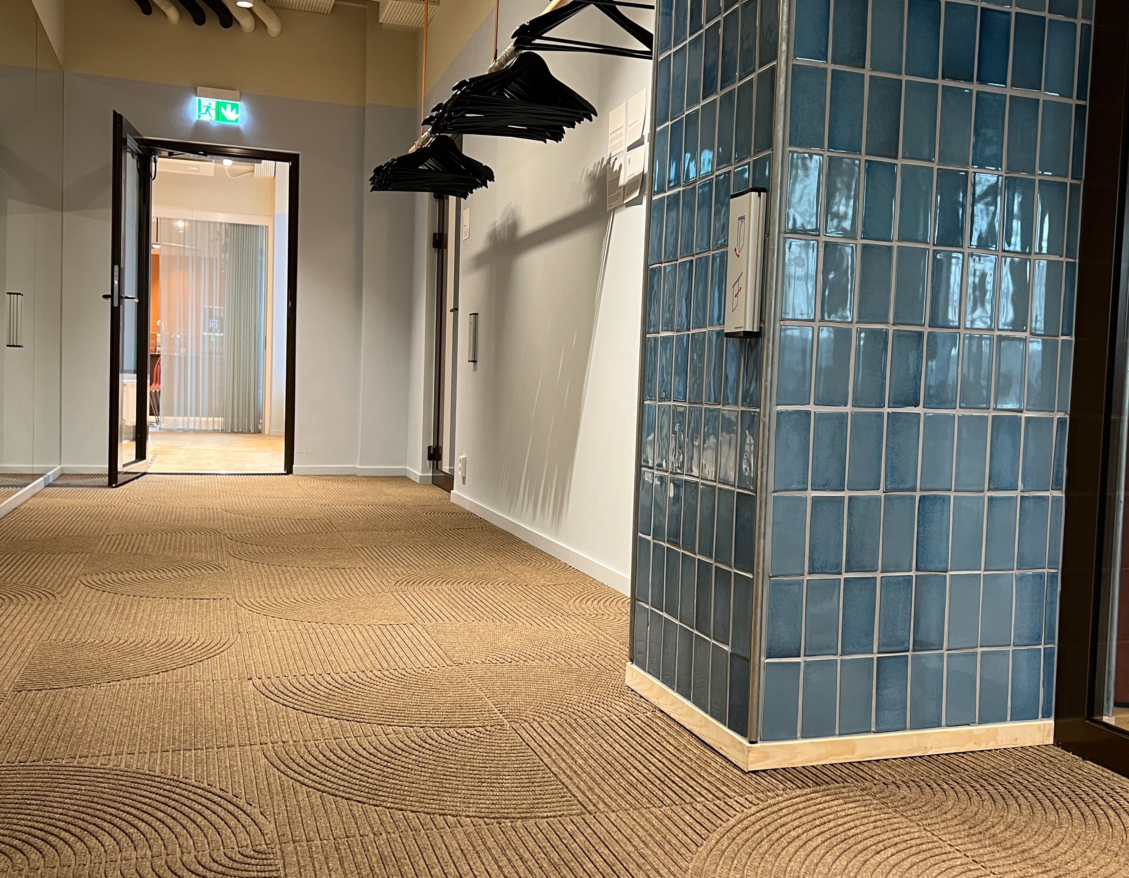 Gjenbruk var en viktig ledestjerne da DOGA skulle finne et nytt hjem. Heymats fliseserie Zen, som kler hele inngangspartiet til de nye lokalene, er laget av resirkulerte plastflasker. Foto: Hanne Tråsdahl / DOGA