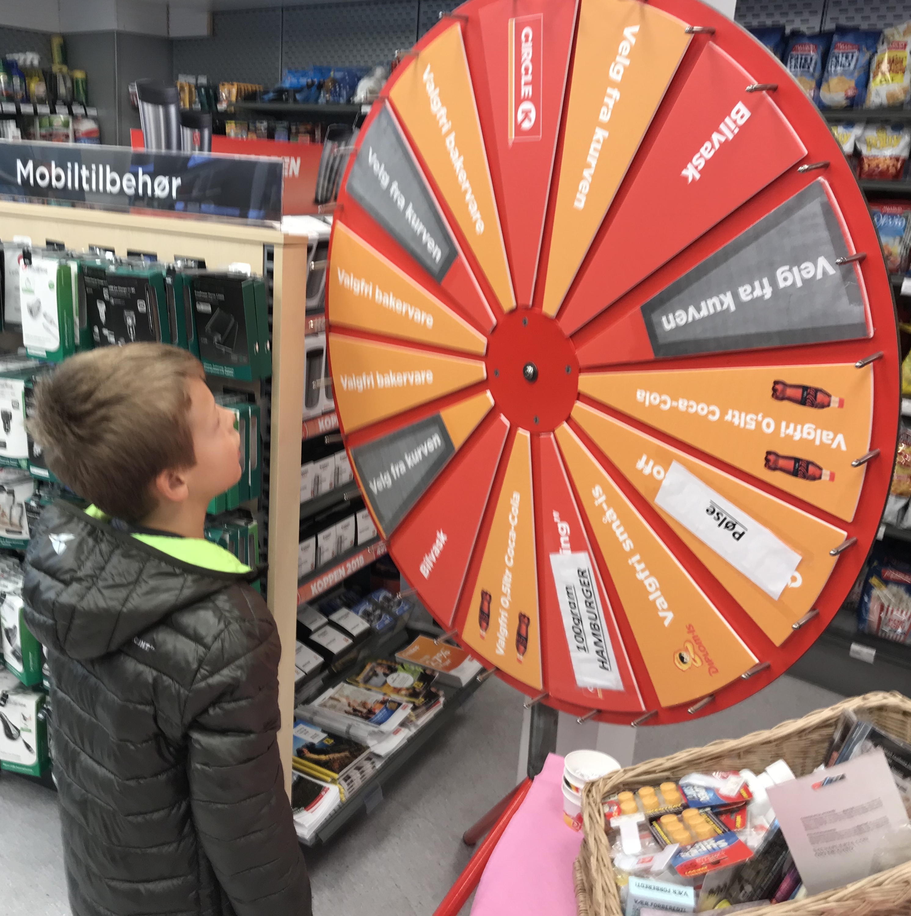 Circle K Flekkefjord fristet med egenlaget lykkehjul til inntekt for Rosa sløyfe-saken.