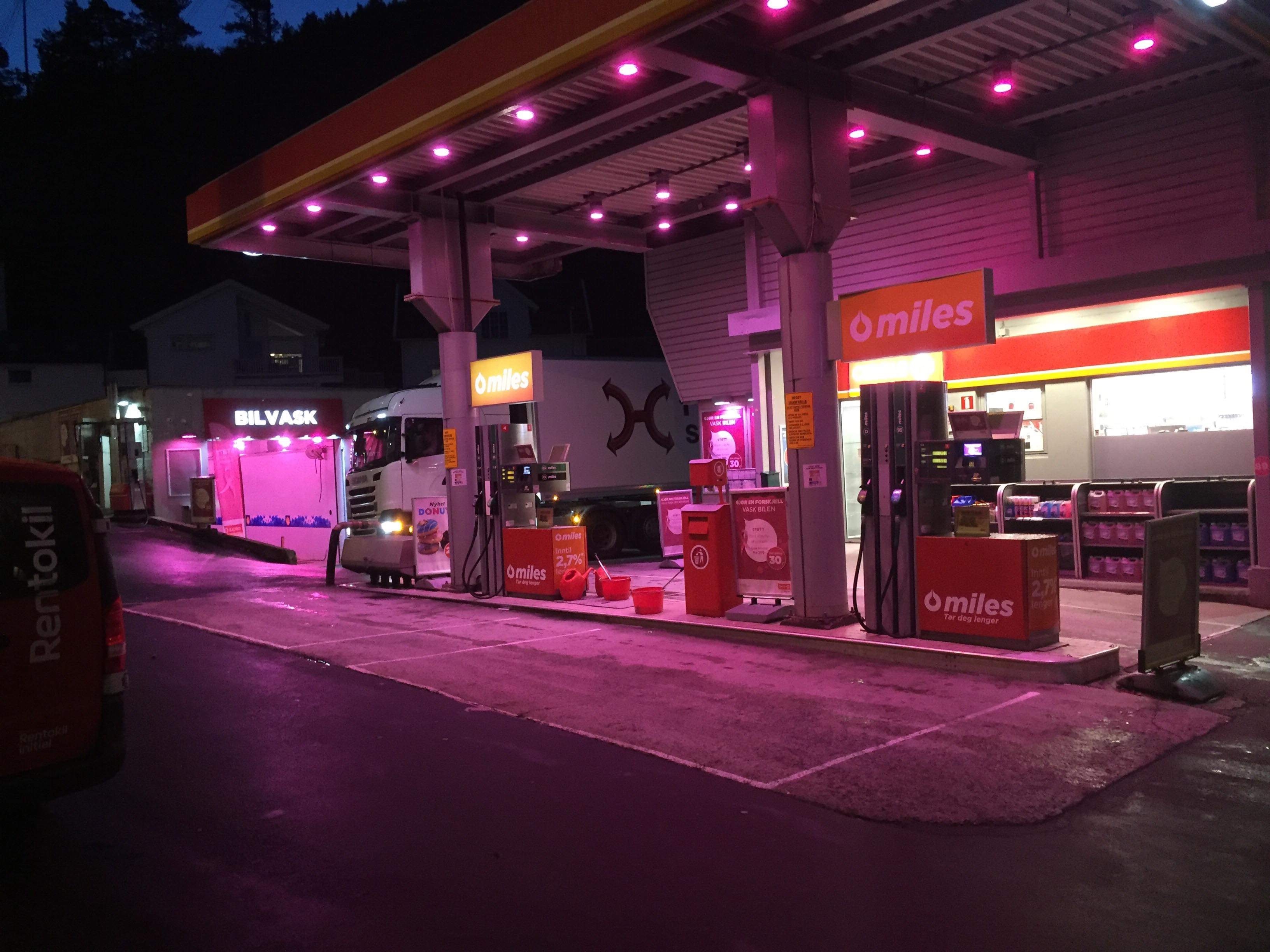 Circle K Flekkefjord lå badet i rosa lys gjennom hele aksjonen.
