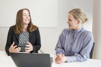 NY NETTSIDE. – Vi gleder oss over at vi snart får en fleksibel, moderne utformet løsning som gjør det enklere å formidle all den kompetansen vi sitter på, sier kommunikasjonsrådgiver Elisabeth Jakobsen (t.h.) i Kreftregisteret. Sopra Sterias Elin Fredriksen til venstre. Foto: Hanne Kristine Fjellheim