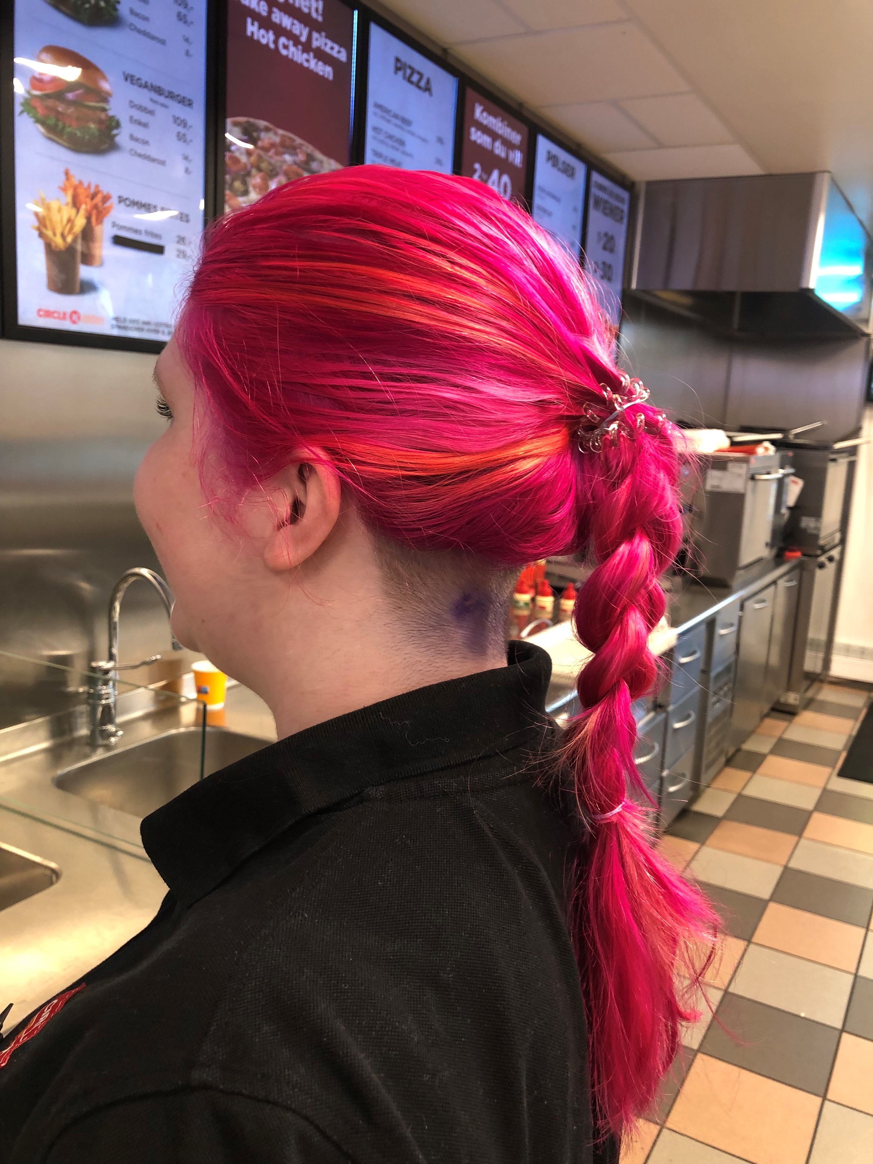 HÅR. Denne Circle K-medarbeideren på Circle K Leirvik farget håret rosa i anledning aksjonen. Foto: Circle K Leirvik