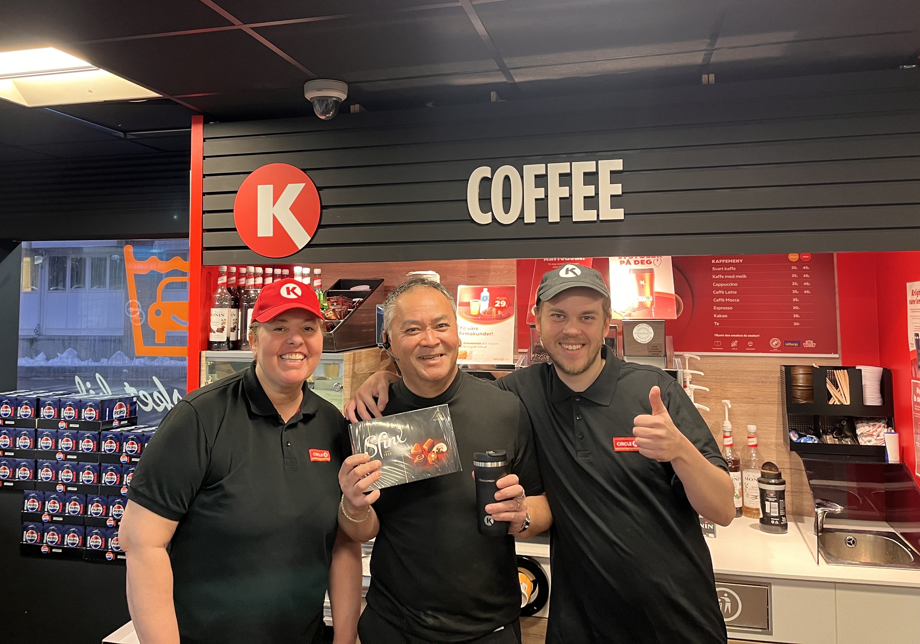 HYGGELIG KUNDE I KRISTIANSAND. Johan Nguyen ble gjort stas på ved stasjonen Circle K Elvegaten i Kristiansand. Her sammen med Jorunn Stomnås og Christoffer Surland Hansen. Foto: Circle K Elvegaten