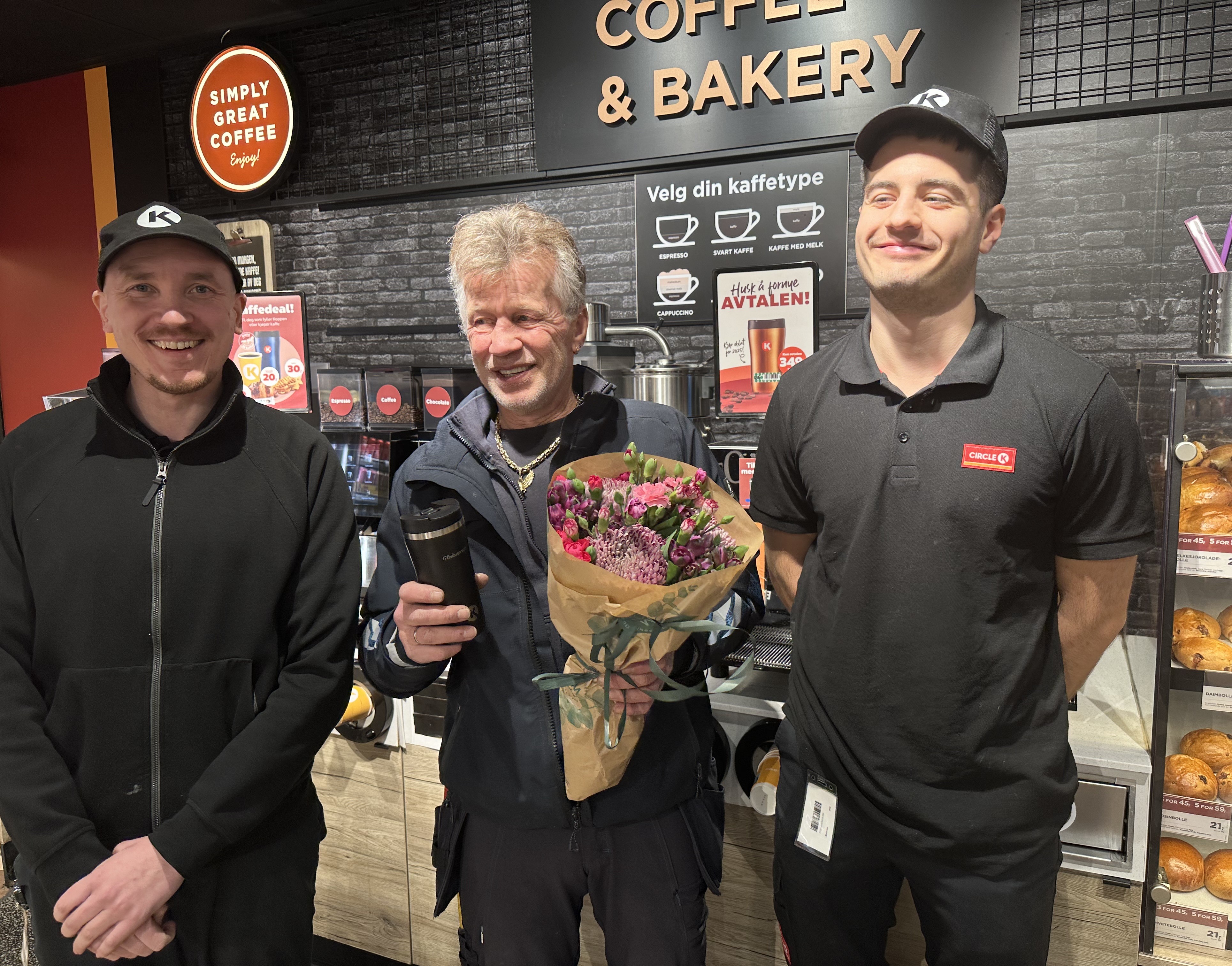 HYGGELIG KUNDE. Jarle Nylund ble gjort stas på ved stasjonen Circle K Fr. Nansens Plass i Tromsø. Her sammen med Ralph Eriksen og Andreas Fjelltun. Foto: Circle K Fr. Nansens Plass