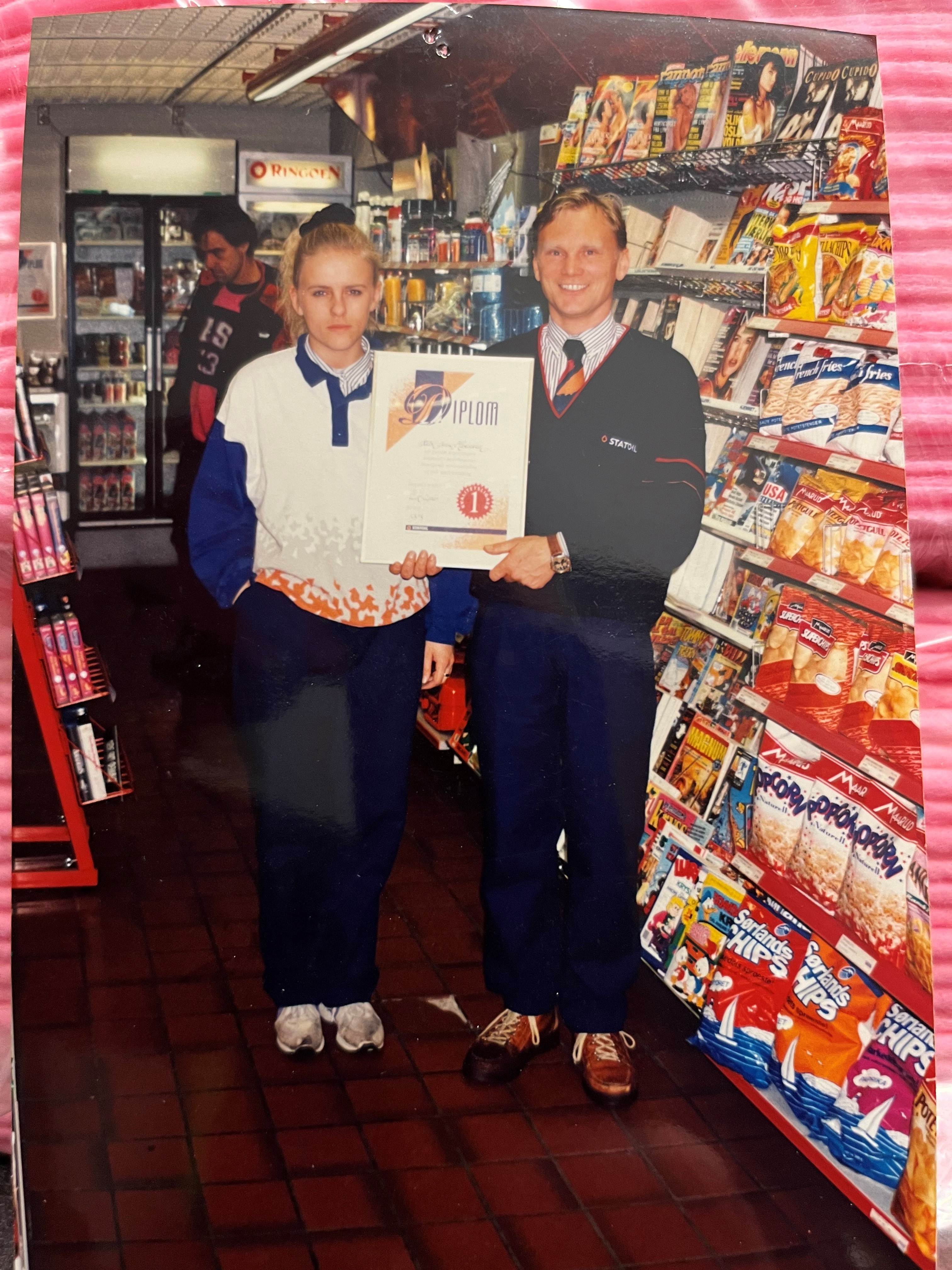GOD ORDEN. John Fjeldsbø og medarbeidere mottar diplom for orden og renhold. Året er 1994. Foto: Privat