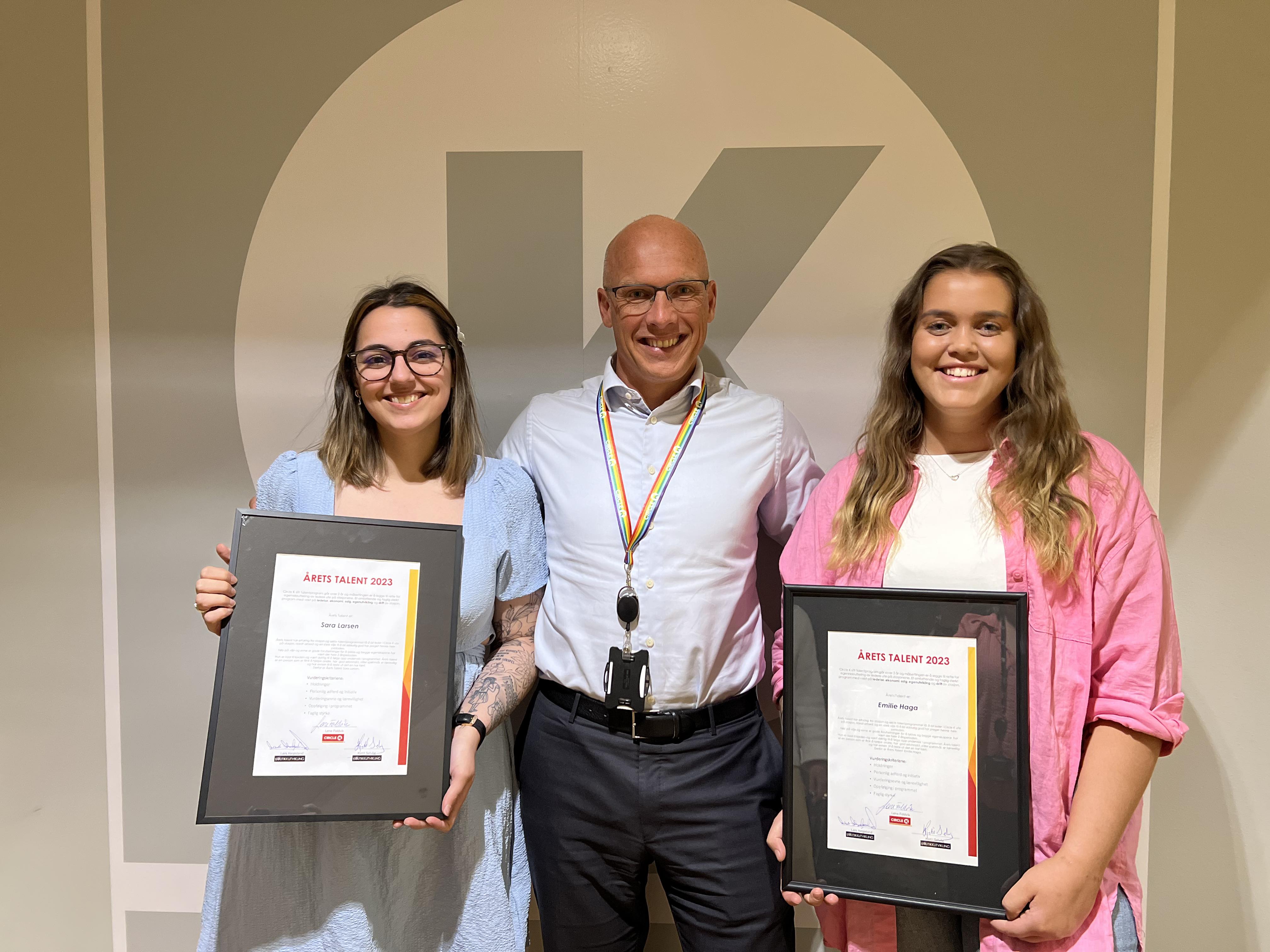 ÅRETS TALENT. Sara Larsen (t.v.) og Emilie Haga ble kåret til «Årets talent» og fikk håndfast bevis fra administrerende direktør i Circle K Norge, Sverre Rosén. Foto: Lene Foldvik