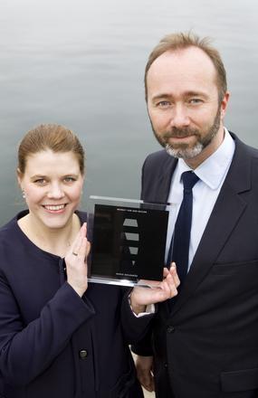 IMPONERT OVER GRÜNDERINNOVASJON: Næringsminister Trond Giske er imponert over hvordan gründerbedriften inPed bruker design til å skape læreinnovasjon i barnehagen. Her med Marte Grevsgard fra Norsk Designråd samt plaketten for Hedersprisen for god design. Foto: Johnny Syversen
