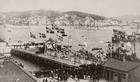 Høytidelig: Havnen i Kristiansund var vakkert pyntet med flagg og vimpler på alle skip i anledning kongefamiliens ankomst. På bryggen ventet byens autoriteter med ordføreren, sakfører Selmer i spissen. Foto: H. Abel/Det kongelige hoffs fotoarkiv