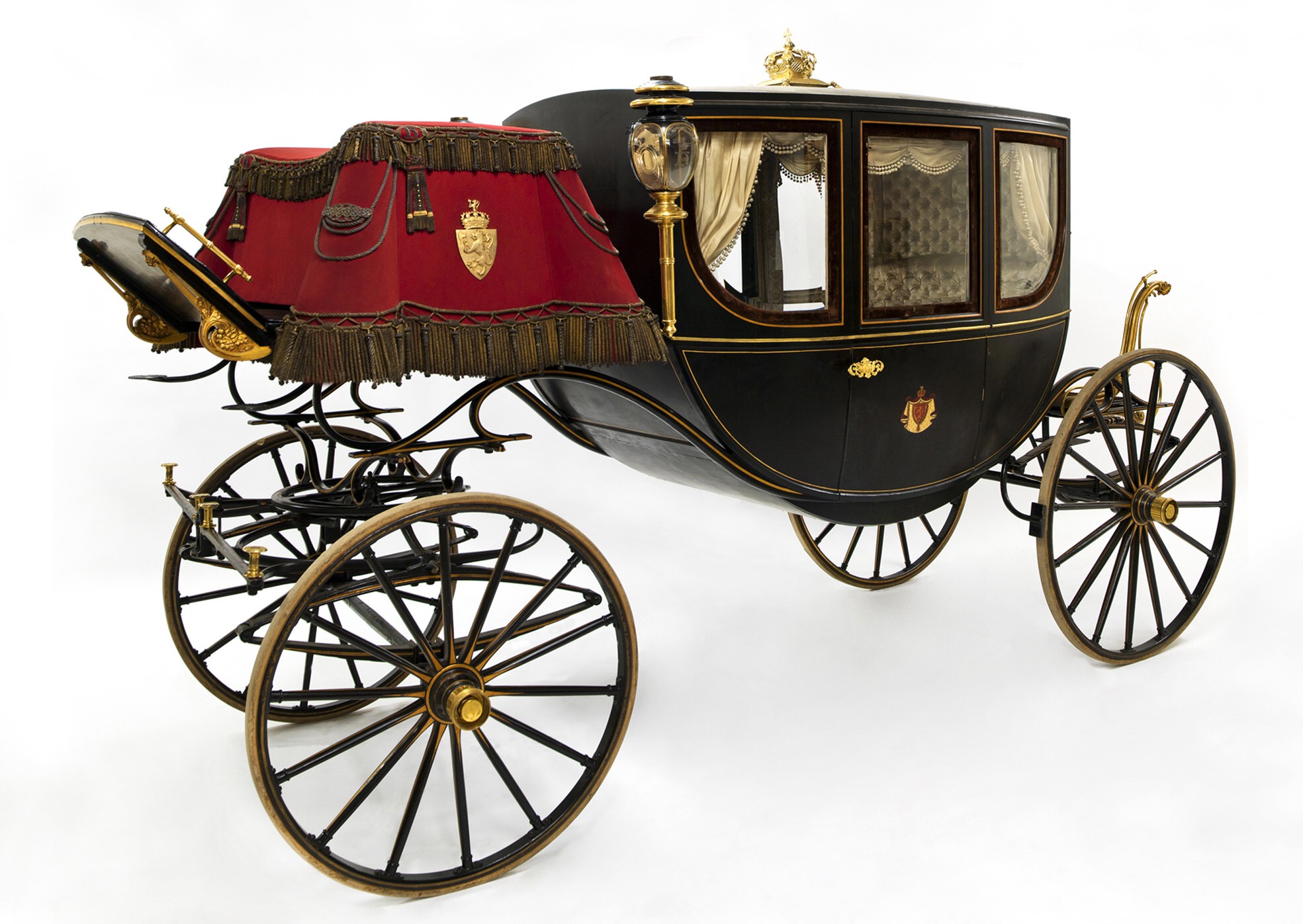Kroningsvognen: Sentralt i utstillingen står denne gallaberlineren, som ble laget til kroningen i Trondheim i 1906. Den ble produsert hos O. Sørensen i Kristiania og viser at norsk vognmakerkunst var på høyde med det beste i Europa. Foto: Jan Haug/Det kongelige hoff