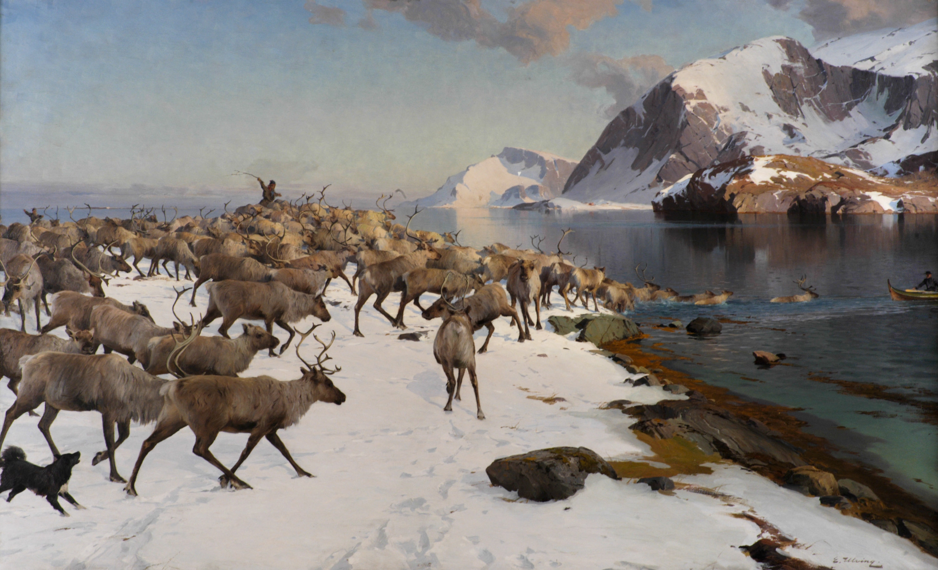 Folkegave fra Helgeland: Maleriet Motiv fra Helgeland. Vinterlandskap med reinsdyr av Even Ulving ble gitt fra Helgelands borgere som kroningsgave til kong Haakon og dronning Maud. Foto: Kjartan Hauglid/Det kongelige hoff