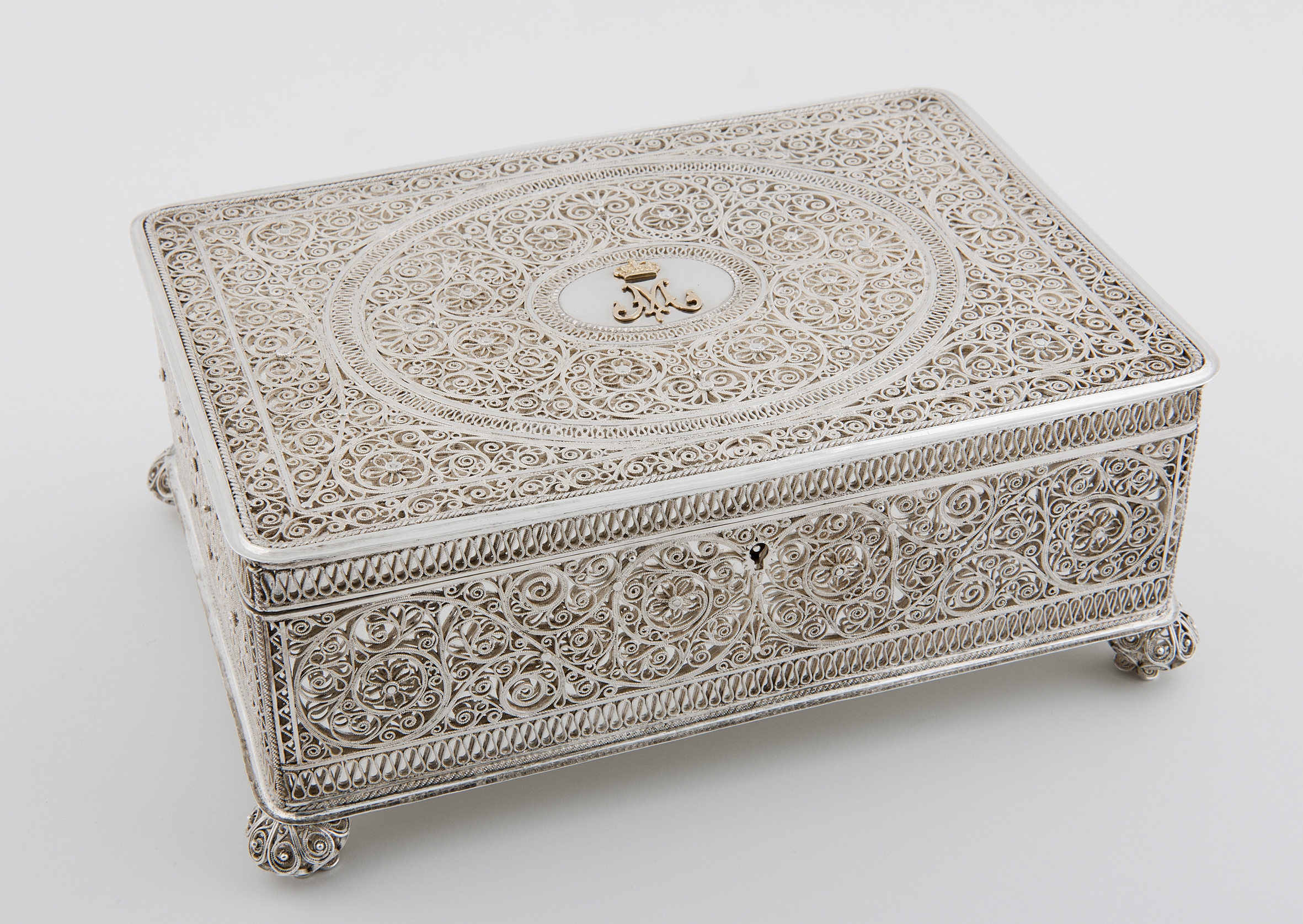 Folkegave fra Lillehammer: Et sølvsmykkeskrin i filigran ble overlevert dronning Maud i anledning hennes fødselsdag 26. november 1905. Filigransarbeidet var utført hos gullsmed Frisenberg. Gaven var signert Damer i Lillehammer. Foto: Jan Haug/Det kongelige hoff