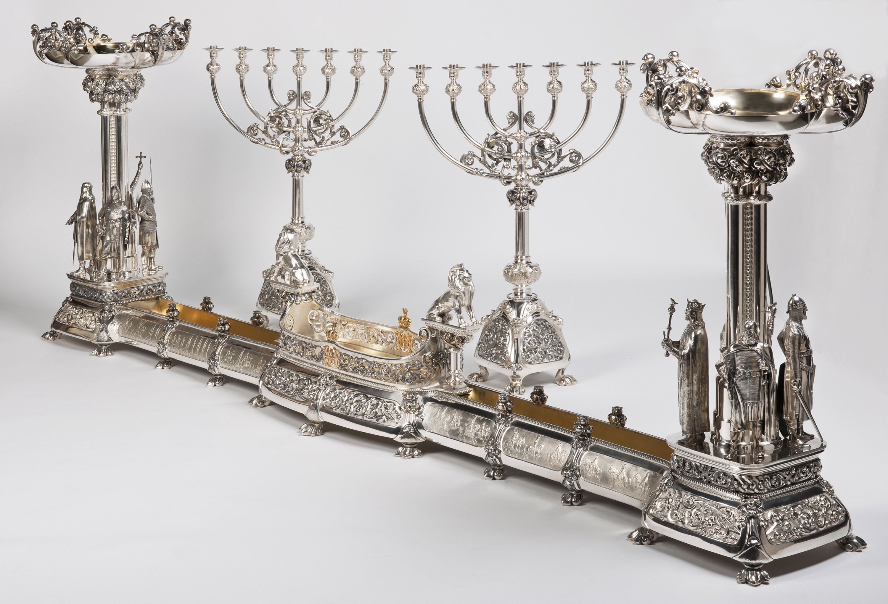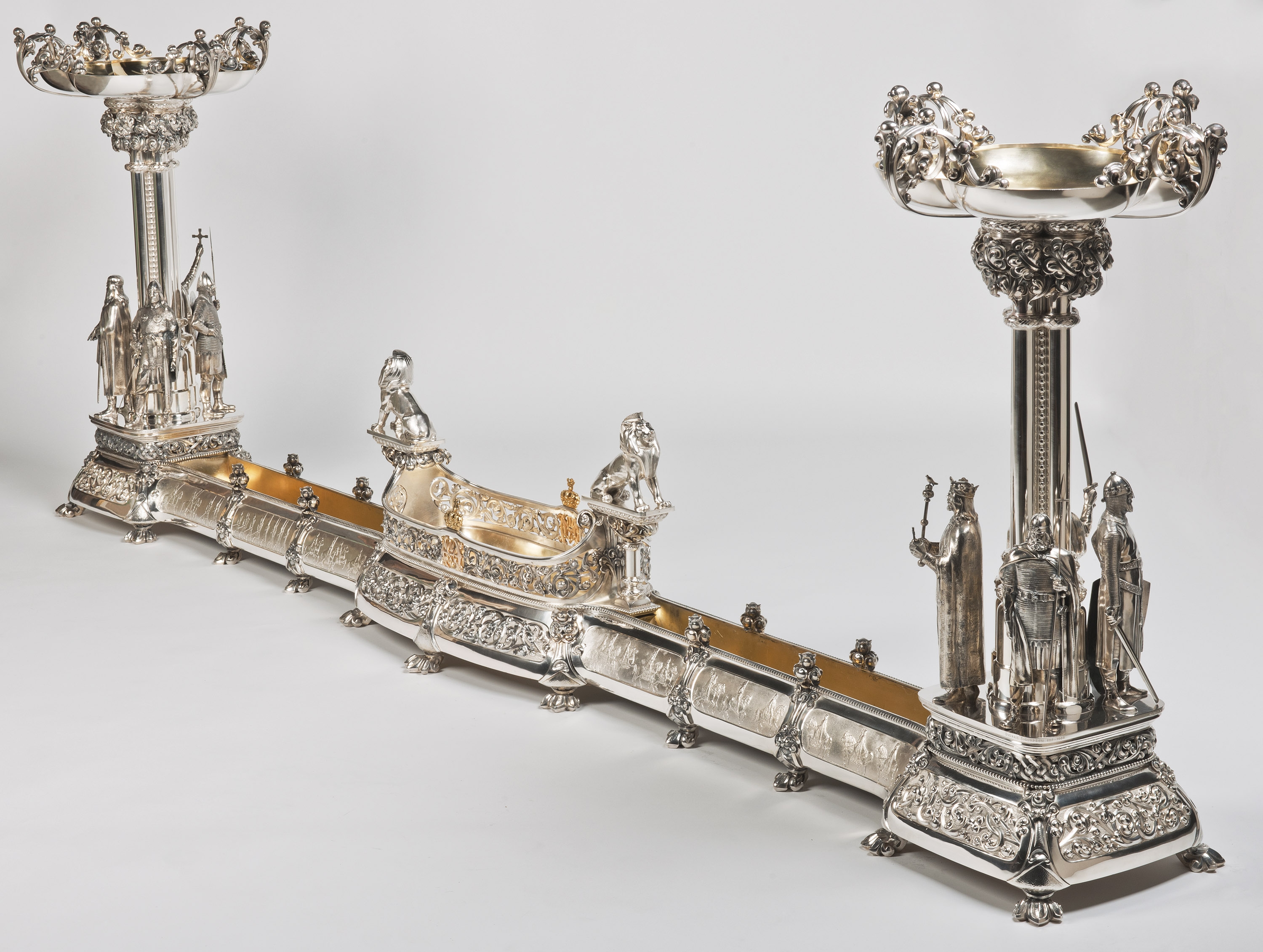 Norsk arv i fokus: Folkegavene til kongeparet skulle vise Norges arv og historie og ble gjerne utformet med inspirasjon fra vikingtid og sagatid. Denne massive vikingoppsatsen i sølv er tegnet av Lars Utne og Torolf Prytz og utført av gullsmedfirmaet J. Tostrup. Den består av sju deler, veier 103 kilo og bærer innskriften Til Dronning Maud fra Damer i Kristiania med Omegn.