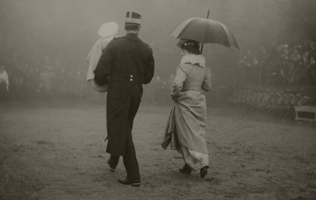 Kongen av Fløien Etter kroningen i Trondheim 22. juni 1906 reiste kong Haakon, dronning Maud og lille kronprins Olav langs vestlandskysten med D/S Heimdal. Her besøker de Bergen i regn og tåke, 24. juli 1906. Foto: Louis Anton Jacobsen. Det kongelige hoffs fotoarkiv