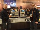 KAFFESELGERE. Nico og Mehamed ved Statoil Furuset E6 viser fram det nye kaffekonseptet. Foto: Statoil Furuset E6