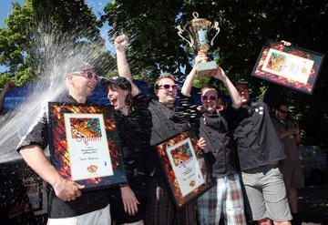 GULLCHAMPIS: Vinnerne av NM i grilling, Team BarbieQ, fikk seg en god dusj champis fra fjorårts vinnere, Sviddmat.no. Lagleder Jan Ivar Nykvist med pokalen. Foto: Johnny Syversen