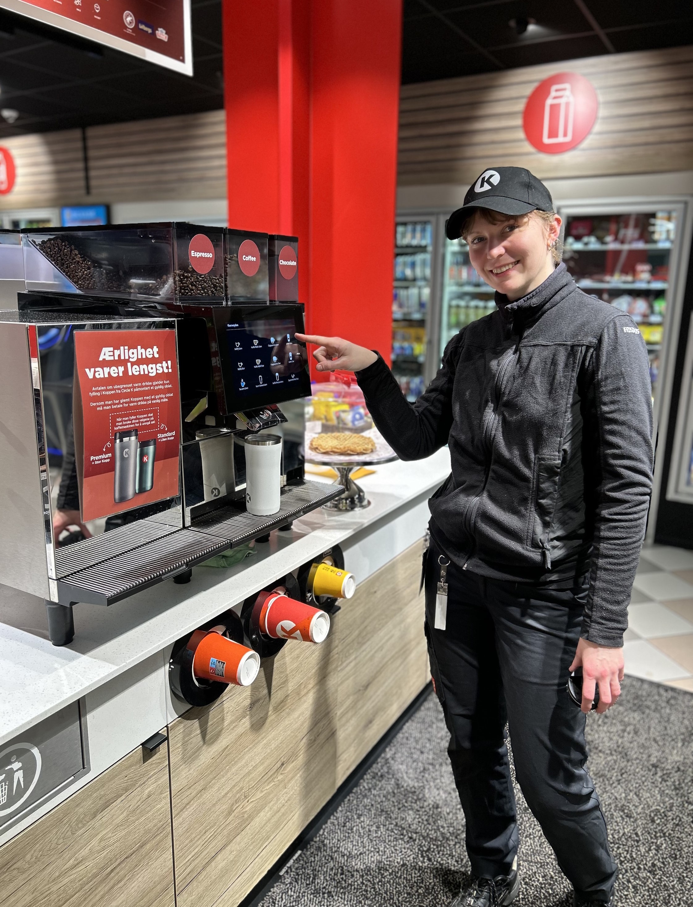 KAFFETØRSTE BERGENSERE. Assisterende daglig leder Lucia Andalova viser hvordan kaffemaskinen på Circle K Viken virker. Foto: Circle K Viken