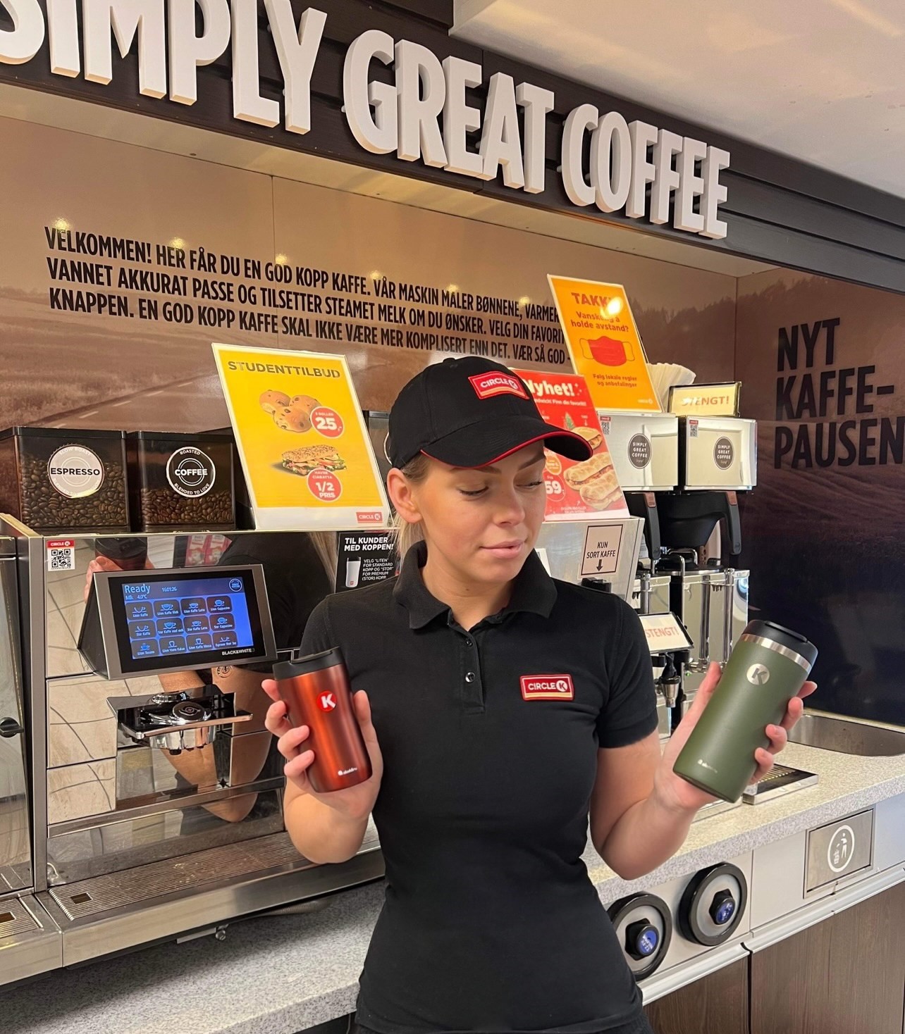 NY KOPP. Kaffedronning Eirin Landro Angeltveit viser fram Koppen 2022, en kopp som eieren kan fylle ubegrenset med varm drikke gjennom hele neste år. Foto: Circle K Helleveien
