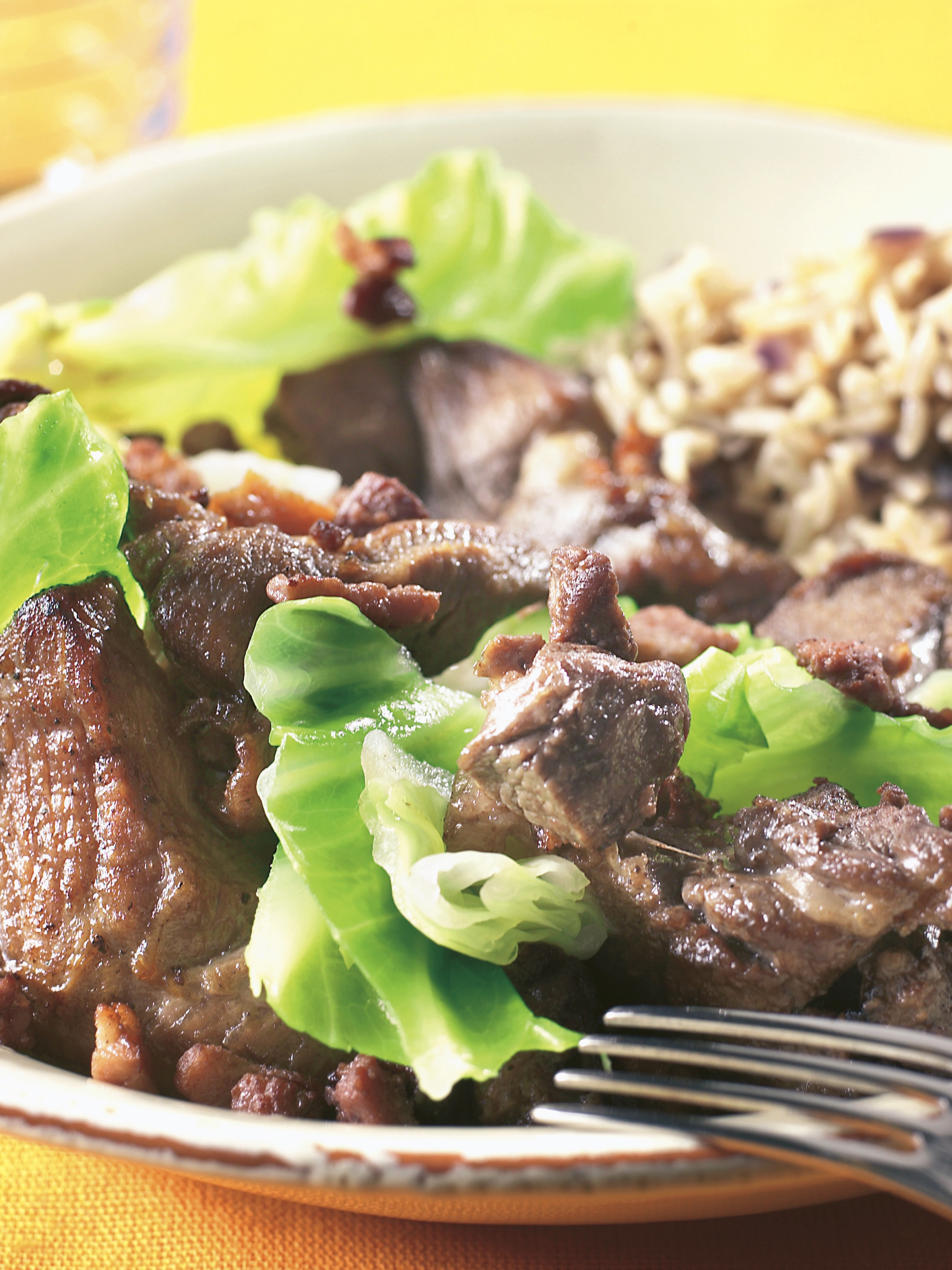 Legg kjøtt og kål lagvis i en gryte. Strø salt og pepper mellom lagene. Pepperkornene kan også legges i en spesiell pepperholder.