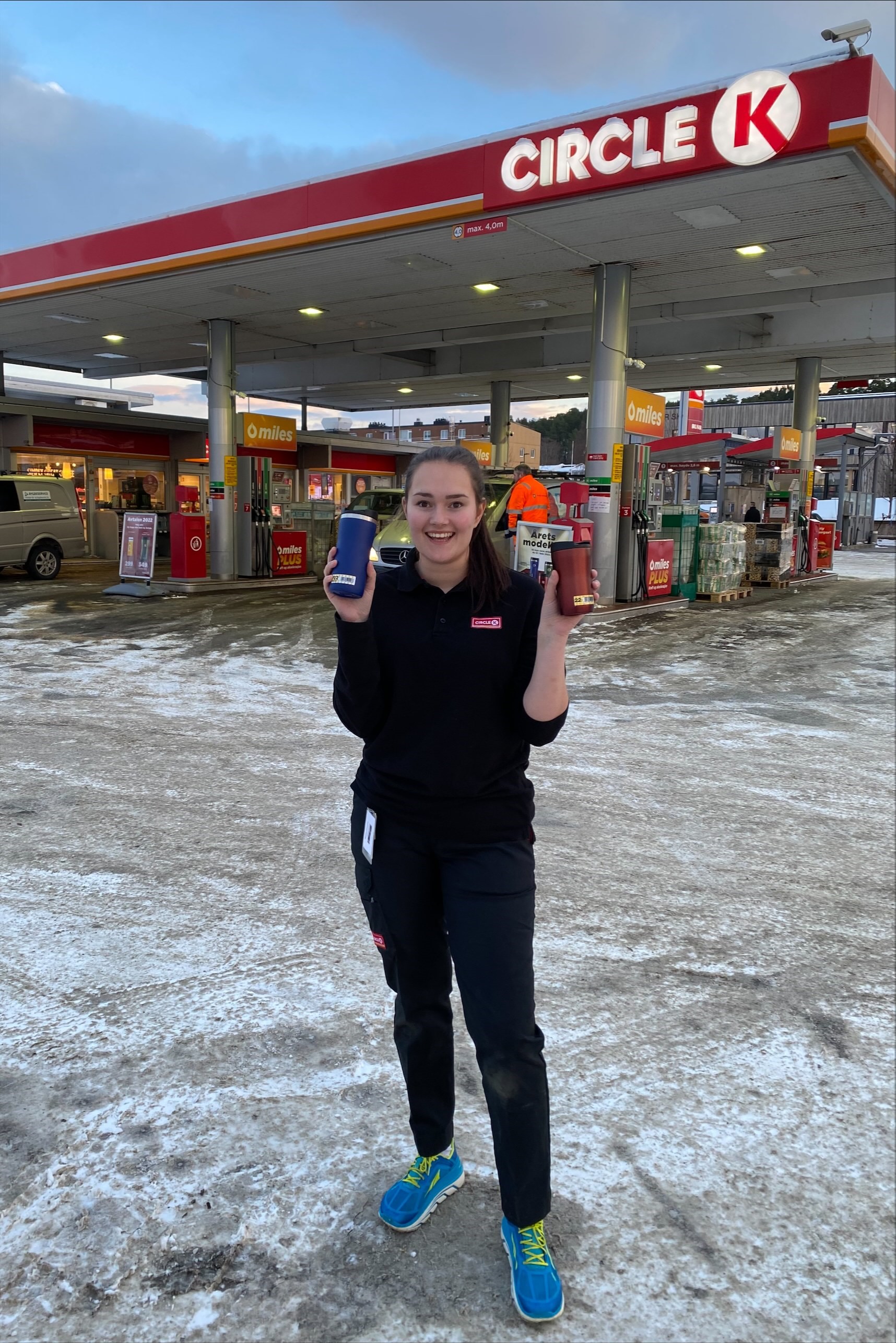 NY KOPP. Helene Victoria Nygård viser fram Koppen 2022, en kopp som eieren kan fylle ubegrenset med varm drikke gjennom hele neste år. Foto: Circle K Sannan