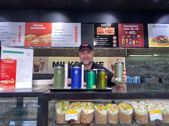NY KOPP. Kaffekongen Lars Gullichsen viser fram Koppen 2022, en kopp som eieren kan fylle ubegrenset med varm drikke gjennom hele neste år. Foto: Circle K E18 Horten