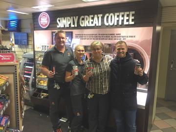 NYTT KAFFEKONSEPT. Fornøyd kaffekunde poserer med ansatte ved Statoil Langneset foran «Simply Great Coffee»-anlegget. Foto: Statoil Langneset