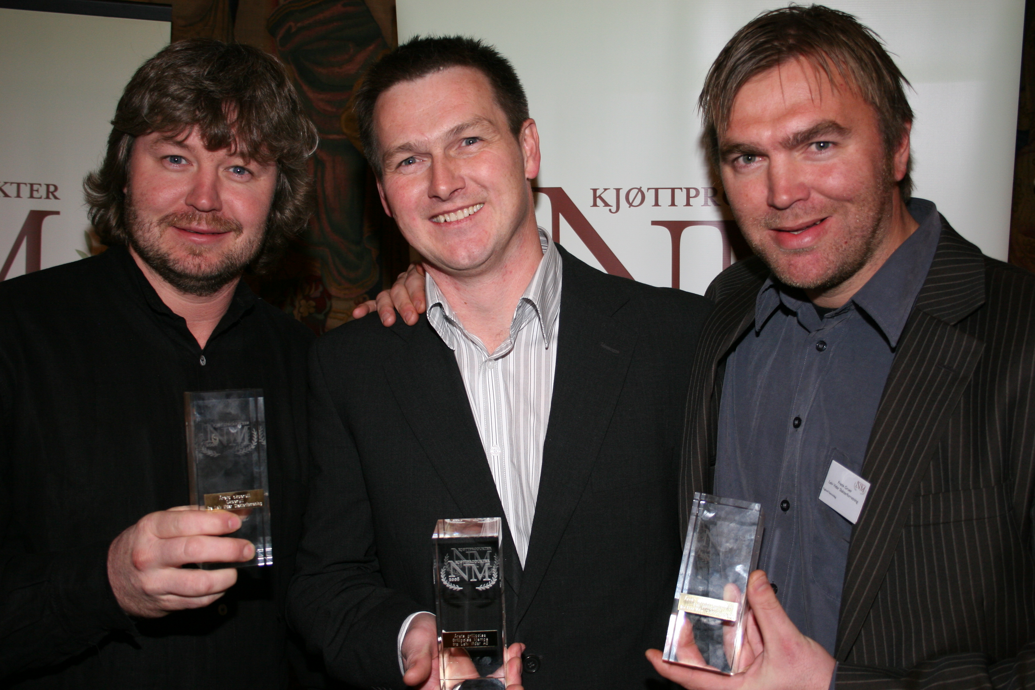 VINNERE: Det var stor glede i Leiv Vidar da årets vinnere ble ropt fram. Fra venstre: Jon Gulbrandsen (daglig leder i Leiv Vidar Slakterforretning), Jan Erik Andreasen (produksjonssjef Leiv Vidar) og Frede Gruer (påtroppende daglig leder Leiv Vidar Slakterforretning). Foto: Tale B. Jordbakke/Pressenytt