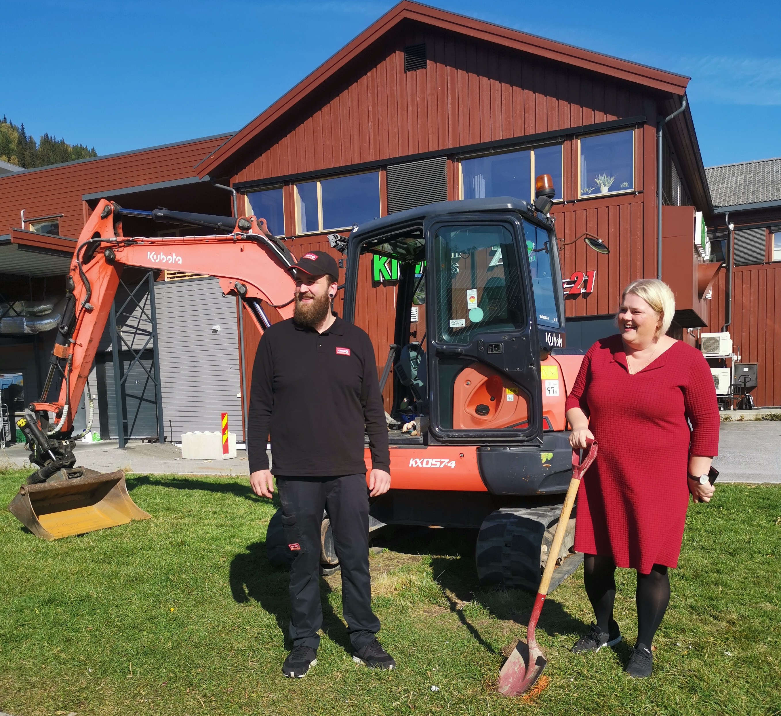 BYGGESTART. Ordfører Solveig Vestenfor markerer den offisielle byggestarten på Circle K Ål. Her sammen med daglig leder på stasjonen, Øyvind Kaslegard. Foto: Circle K Ål