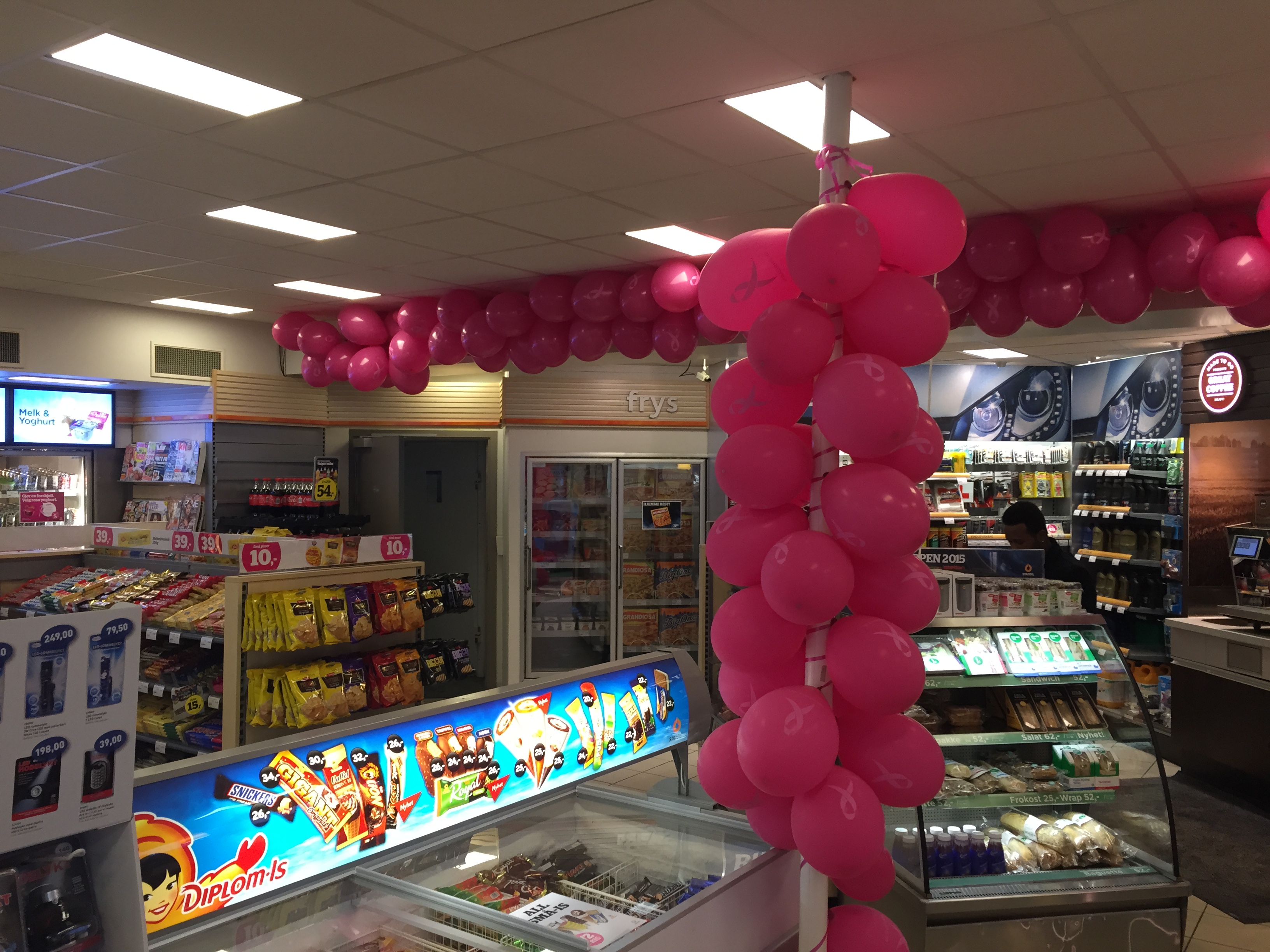 For å skape blest om aksjonen har butikken blitt pyntet med flere hundre rosa ballonger. Også utelyset og vaskehallen var rosa i hele oktober.