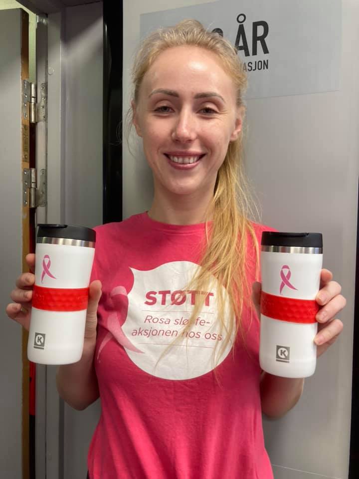 ROSA KAFFE PÅ SVOLVÆR. En medarbeider på Circle K Svolvær viser fram en av årets Rosa sløyfe-artikler, en rosa kaffekopp. Foto: Circle K Svolvær