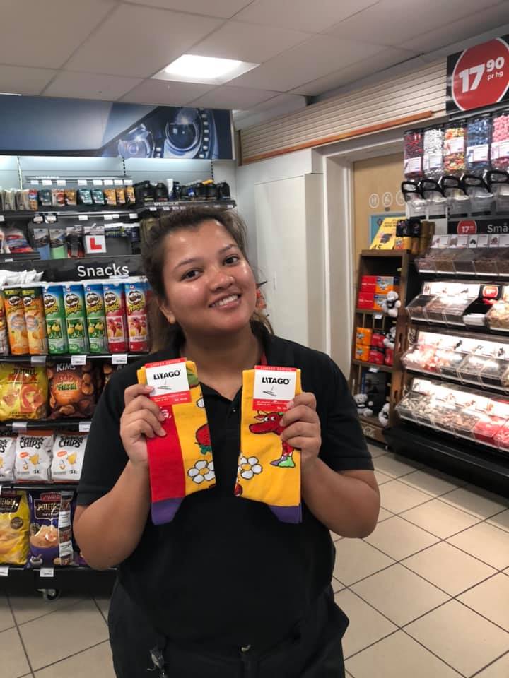 AUKSJON II. På Circle K Sævelandsvik kunne du by på Litago-sokker til inntekt for Rosa sløyfe. Foto: Circle K Sævelandsvik