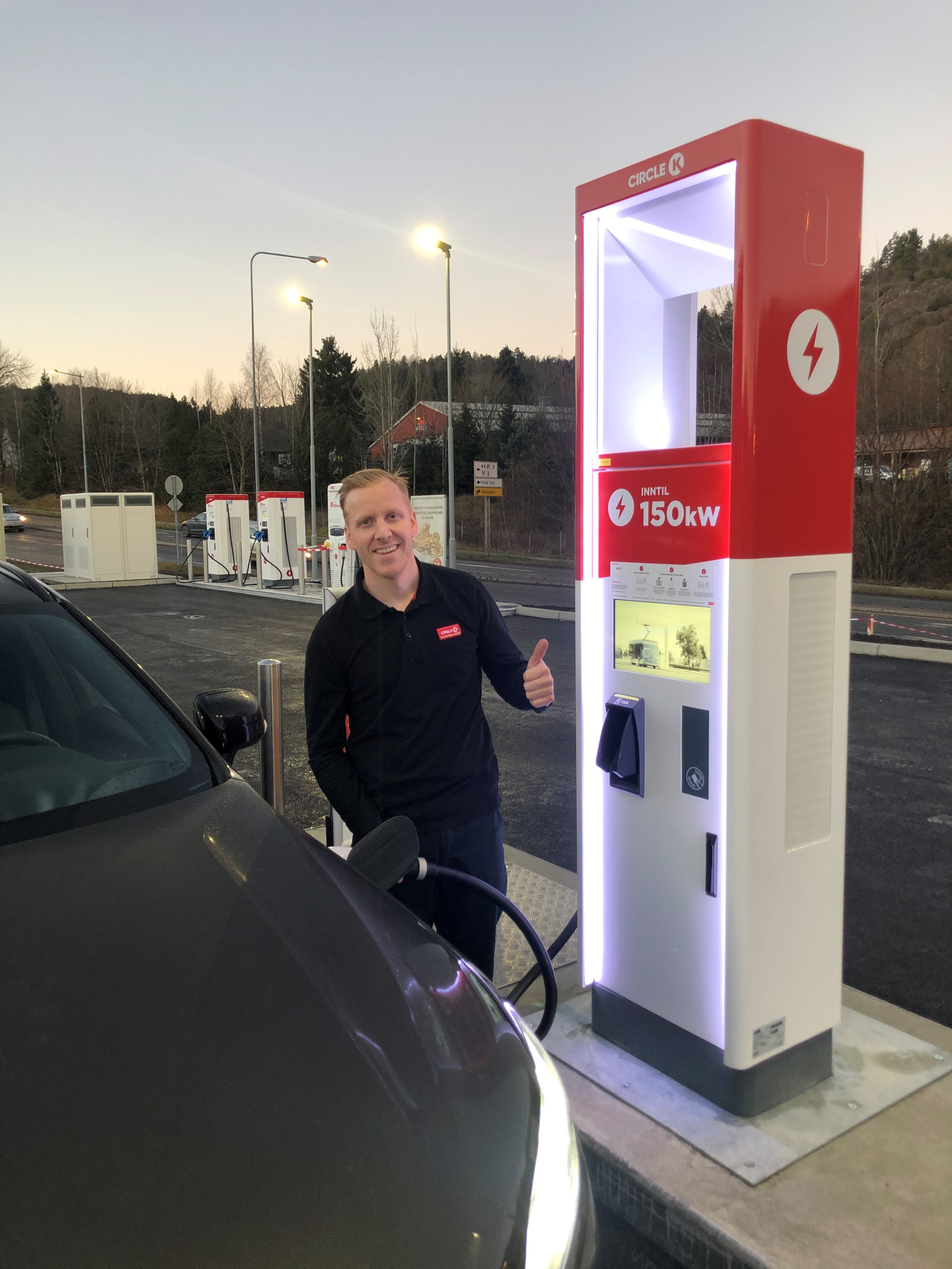 LADER OPP. Daglig leder Even Øygarden ved Circle K Telemarksporten gir tommel opp til de nye laderne som er installert på stasjonen hans. Foto: Circle K Telemarksporten