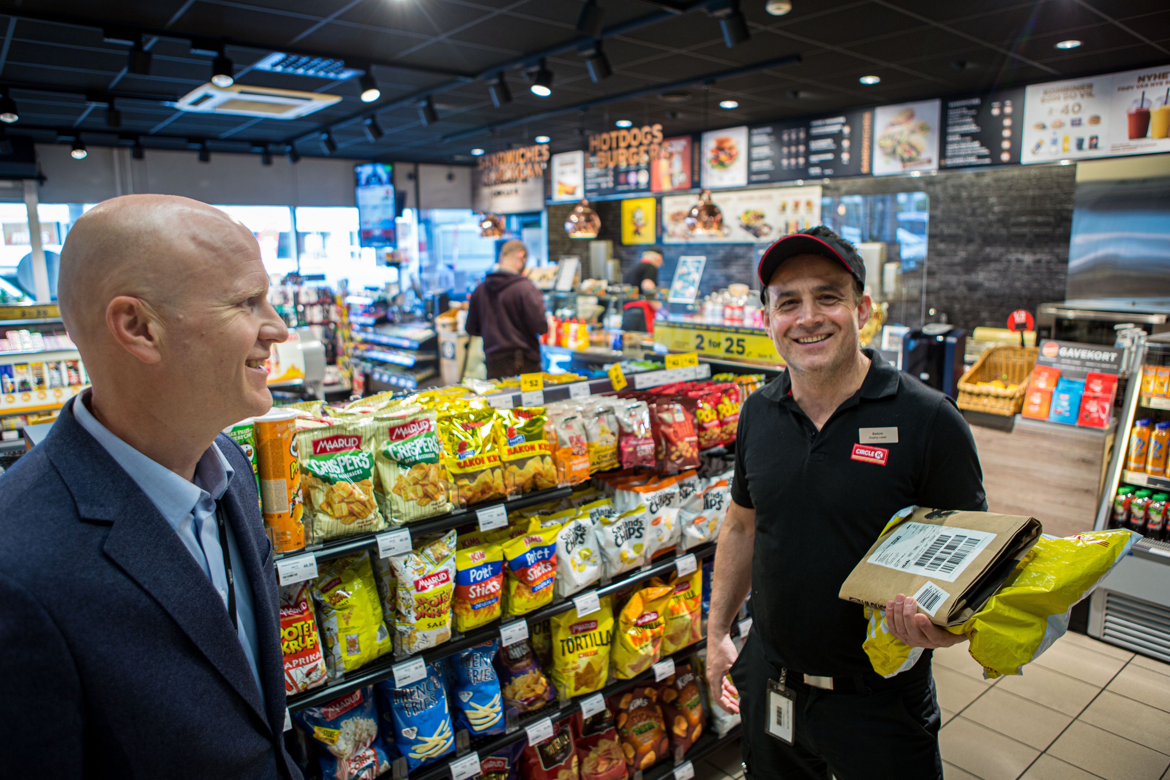 PAKKE PÅ STASJON. Avtaleansvarlig Øyvind Bredland hos Circle K Norge og daglig leder Bekim Istrefi ved Circle K Brynseng gleder seg til å tilby pakkehenting på stasjon. Foto: Johnny Syversen/josy.no