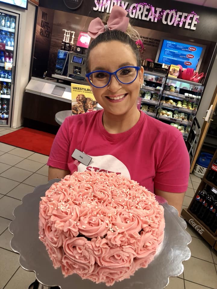 En medarbeider på Circle K Sævelandsvik viser fram en selvbakt bake som ble auksjonert bort til inntekt for Rosa sløyfe. Bildet er fra fjorårets aksjon.
