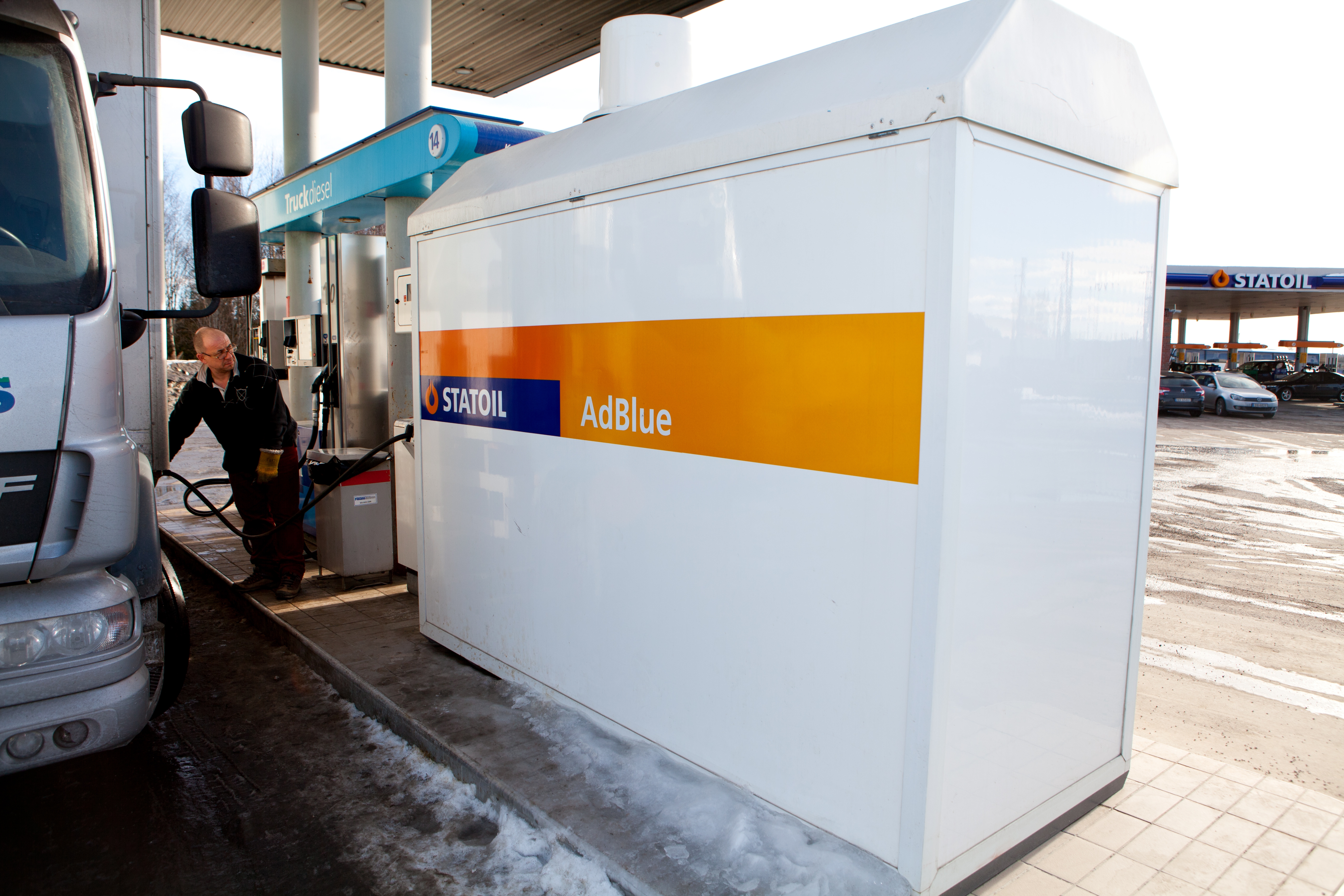 MINDRE NOX-UTSLIPP: Rune Olsen i Plantefoss fyller opp med diesel og AdBlue, et stoff som gjør at 90 prosent av NOx-utslippene i eksosen brytes ned til nitrogen og vanndamp. I fjor solgte Statoil Fuel & Retail 3,5 millioner liter AdBlue, noe som sparte norske veier for utslipp av om lag 1750 tonn NOx. Foto: Johnny Syversen.