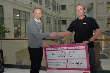 FIKK STOR SJEKK. Etter fjorårets aksjon fikk Ole Alexander Opdalshei i Kreftforeningen overrakt en sjekk på over 4,6 millioner kroner av Circle K, her representert ved Geir Hofgaard fra Circle K Mosseporten. Foto: Henning Hammer Torp/Circle K