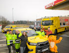 AKSJONSKLARE. Kjetil Svenheim (i midten) og Ingunn Handagard (til høyre) poserer sammen med NAF-maskoten Naffen og to bilbergere fra NAF. Foto: Terje Borud