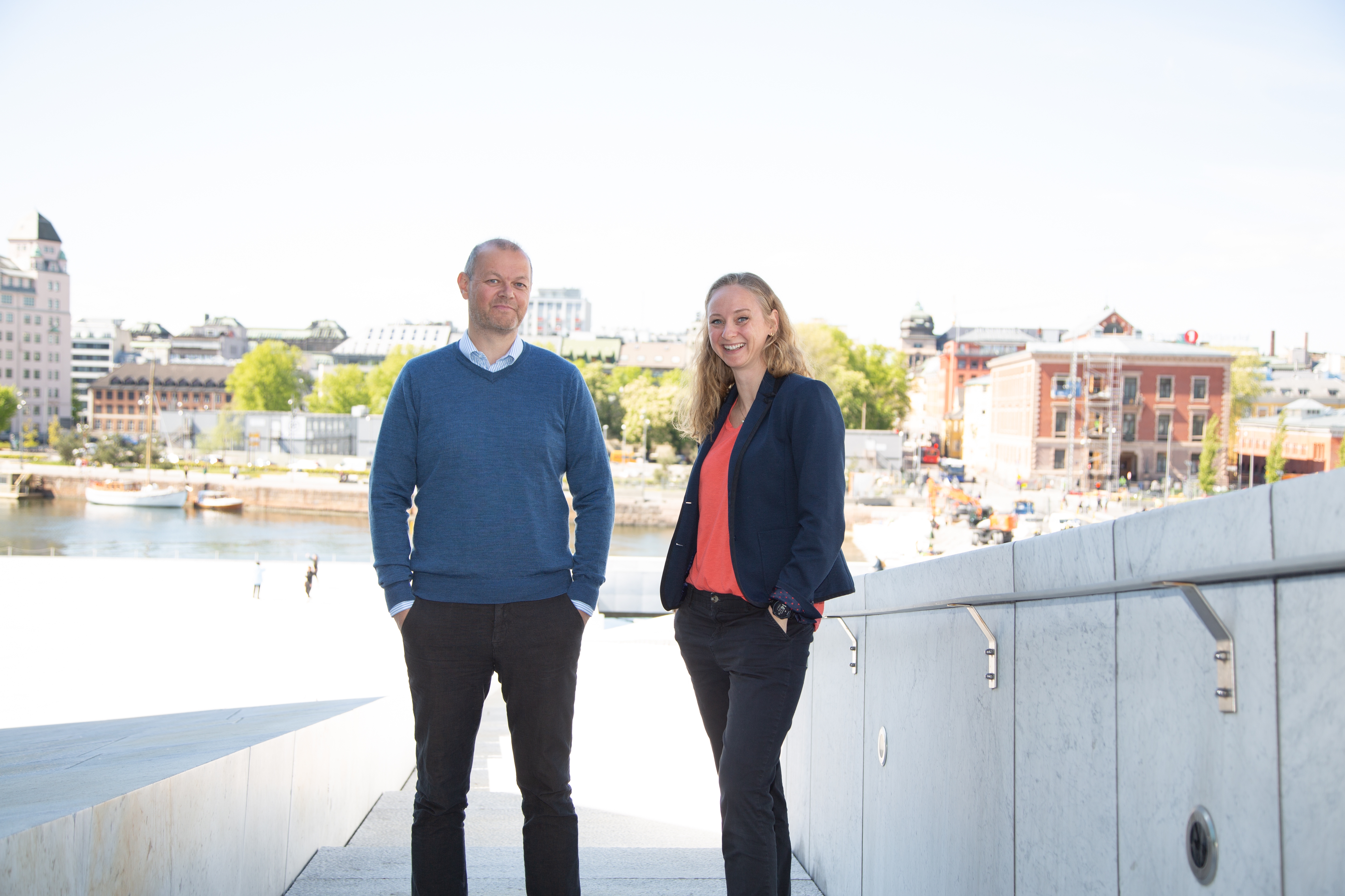 LANDBRUKSTEKNOLOGER. Mette Roald, leder for TINE Radikal Innovasjon, og Torkel Randem, utviklingsleder i Mimiro, er med på å sørge for at norske fjøs digitaliseres. Foto: Sopra Steria