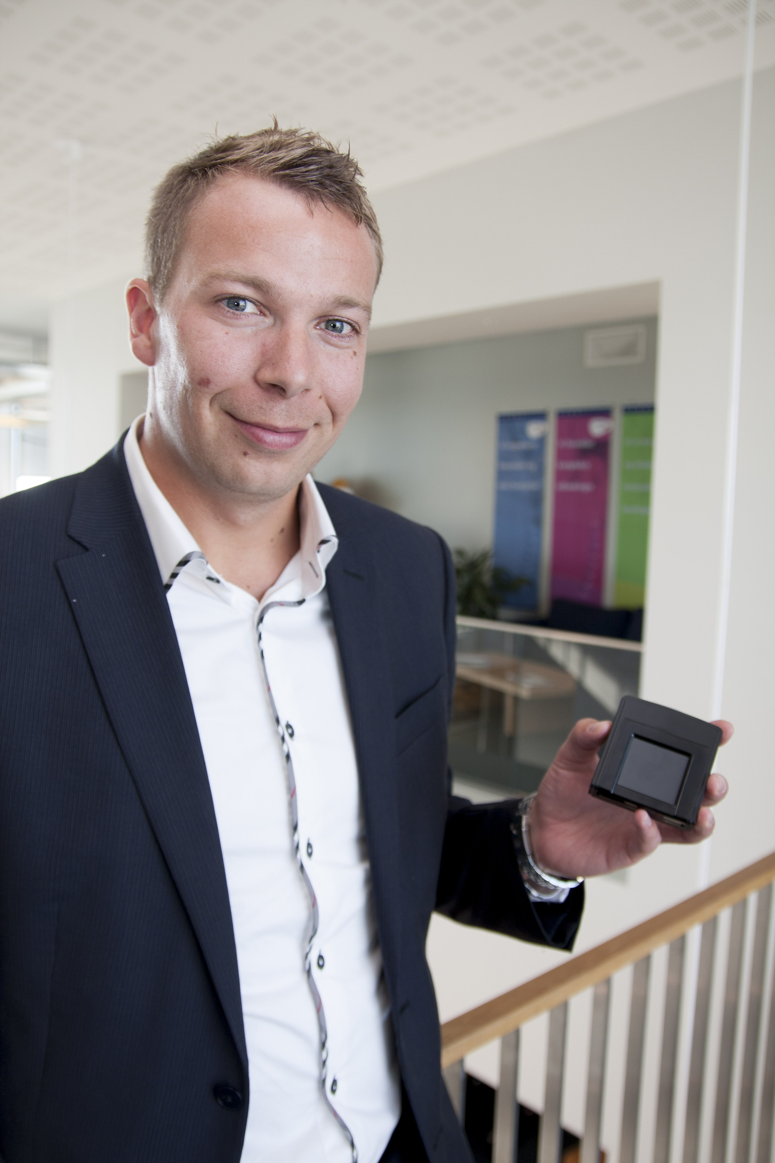 – SIS II er levert sentralt, mens de 29 Schengen-landene tilkobler sine nasjonale systemer fortløpende, sier biometriekspert Ole Marius Steinkjer. Han viser fram en typisk fingeravtrykksleser. Foto: Hanne Kristine Fjellheim/Steria