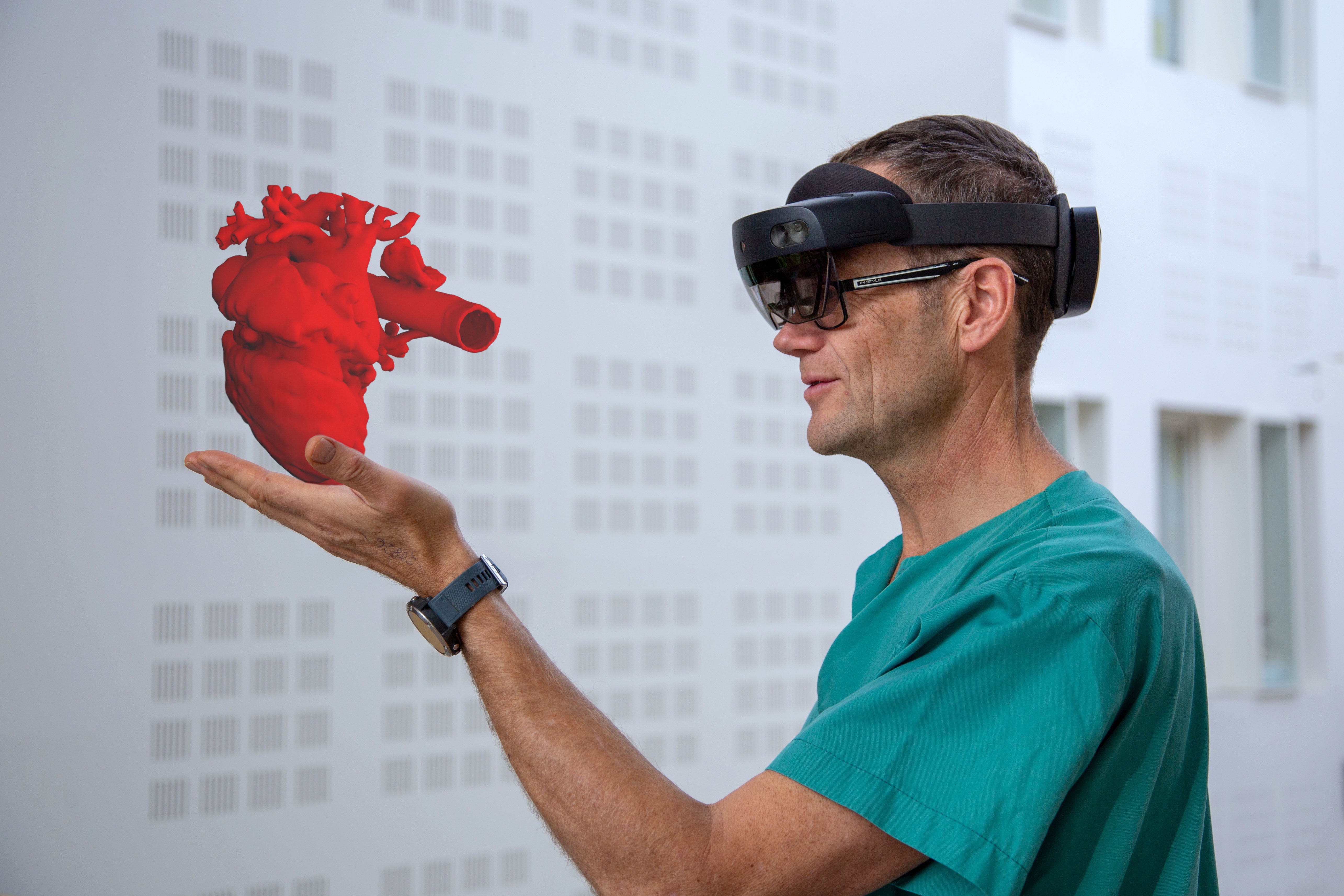MEDISINSKE HOLOGRAMMER. Lege Henrik Brun ved Rikshospitalet holder et hologramhjerte i hånden. Foto/illustrasjon: Stein Olav Pettersen/Sopra Steria.