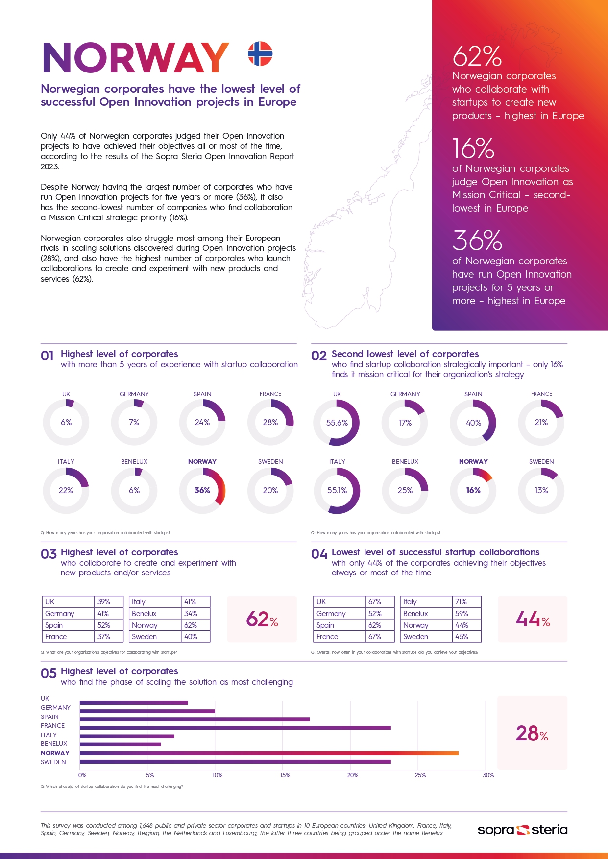 Bak den europeiske rapporten står Sopra Steria, INSEAD og Ipsos. De har undersøkt mer enn 1600 selskaper i 10 land. Tobias Studer Andersson, innovasjonsdirektør i Sopra Steria og leder for Sopra Steria Scale up, sier at rapporten viser at åpen innovasjon faktisk er mer utbredt i Norge enn i andre land.