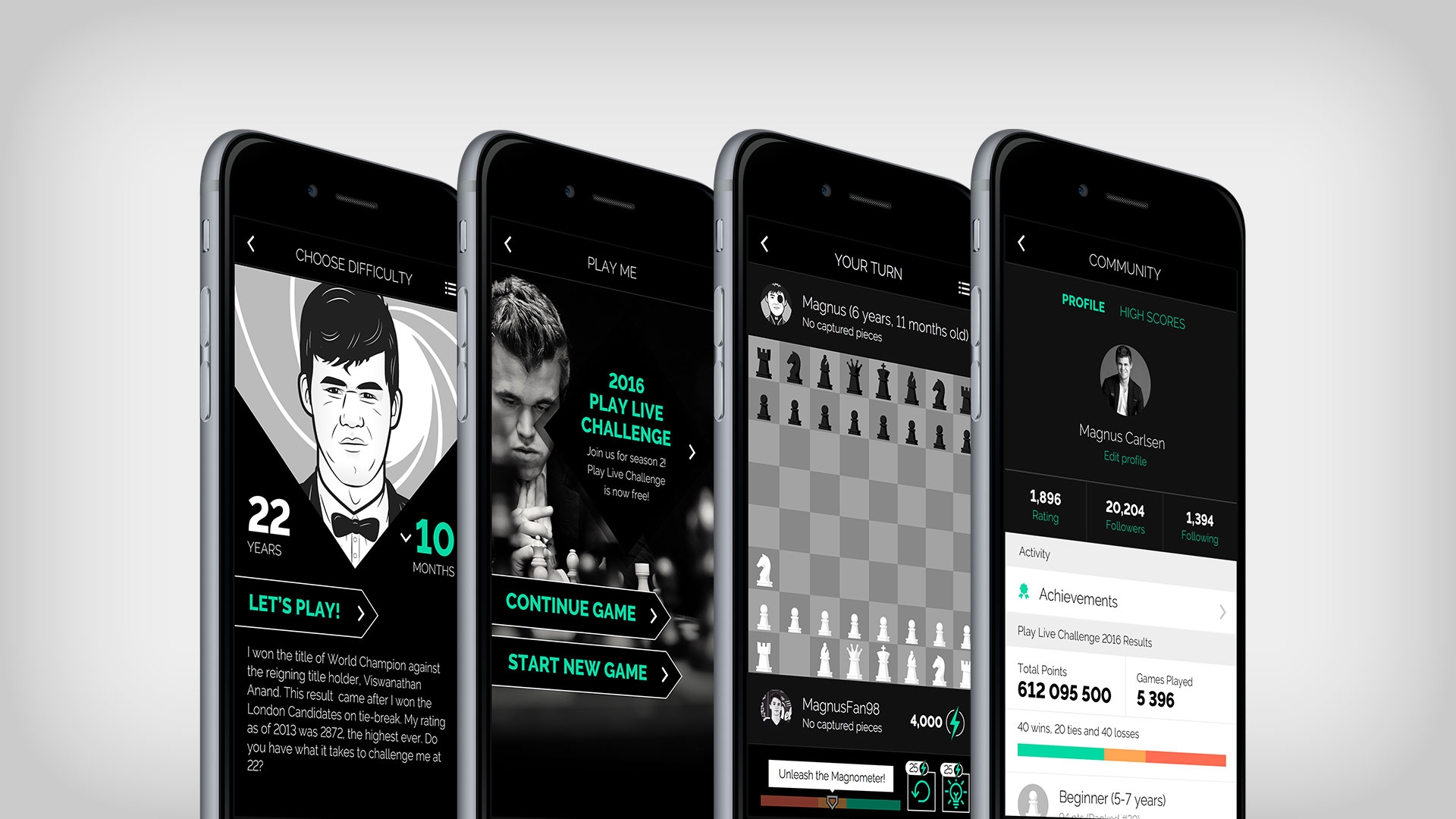 En av ideene til Play Magnus var å gi brukerne muligheten til å spille sjakk mot forskjellige utgaver av Magnus Carlsen, fra alderen 5 og opp til dagens verdensmesterutgave. Dette har blitt en spennende og personlig vri på vanskelighetsnivåene som følger med de mer generiske sjakkprogrammene som finnes på markedet. Det er også lagt mye ressurser i å få til typografi, farger og elementer på en måte som passer til en liten skjerm. Kontraster og lesbarhet følger krav til universell utforming, og strukturen er lagt opp mest mulig intuitivt, slik at det er enkelt å komme i gang.