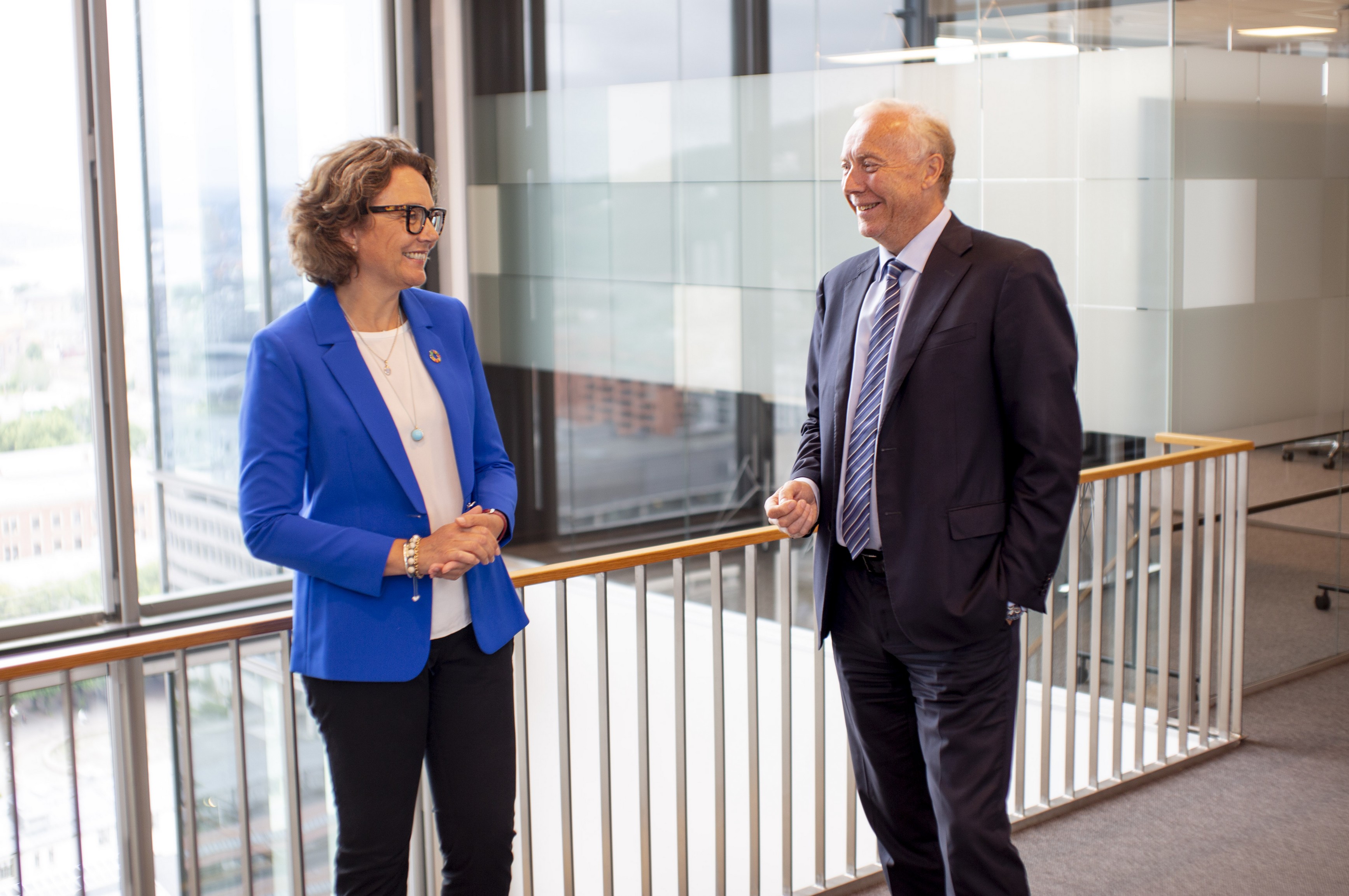 Ved å gjøre organisasjonen smidig kan Posten Norge levere nye tjenester raskere. Her er konsernsjef Tone Wille i samtale med Kjell Rusti, administrerende direktør i Sopra Steria. Foto: Hanne Kristine Fjellheim / Sopra Steria