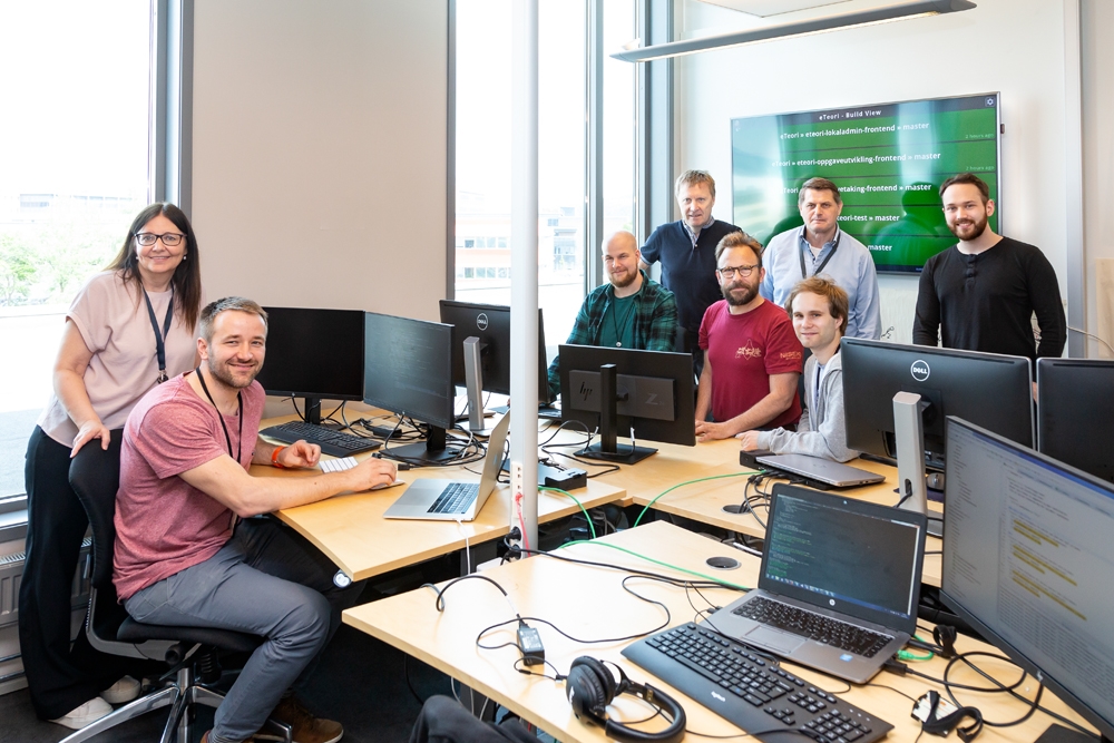 TEAM eTEORI. (f.v.) Gunn Marit Høistad (prosjektleder), Marko Draksic (frontend-utvikler), Sondre Wigmostad Bjerkhaug (backend-utvikler/scrum-master), Dag Solvoll (arkitekt), Syver Enstad (frontend-utvikler), Cato Lybekk (arkitekt/backend-utvikler), Øyvind Emblemsvåg (backend-utvikler) og Morten Andre Svendsen (teknisk tester). Foto: Sopra Steria