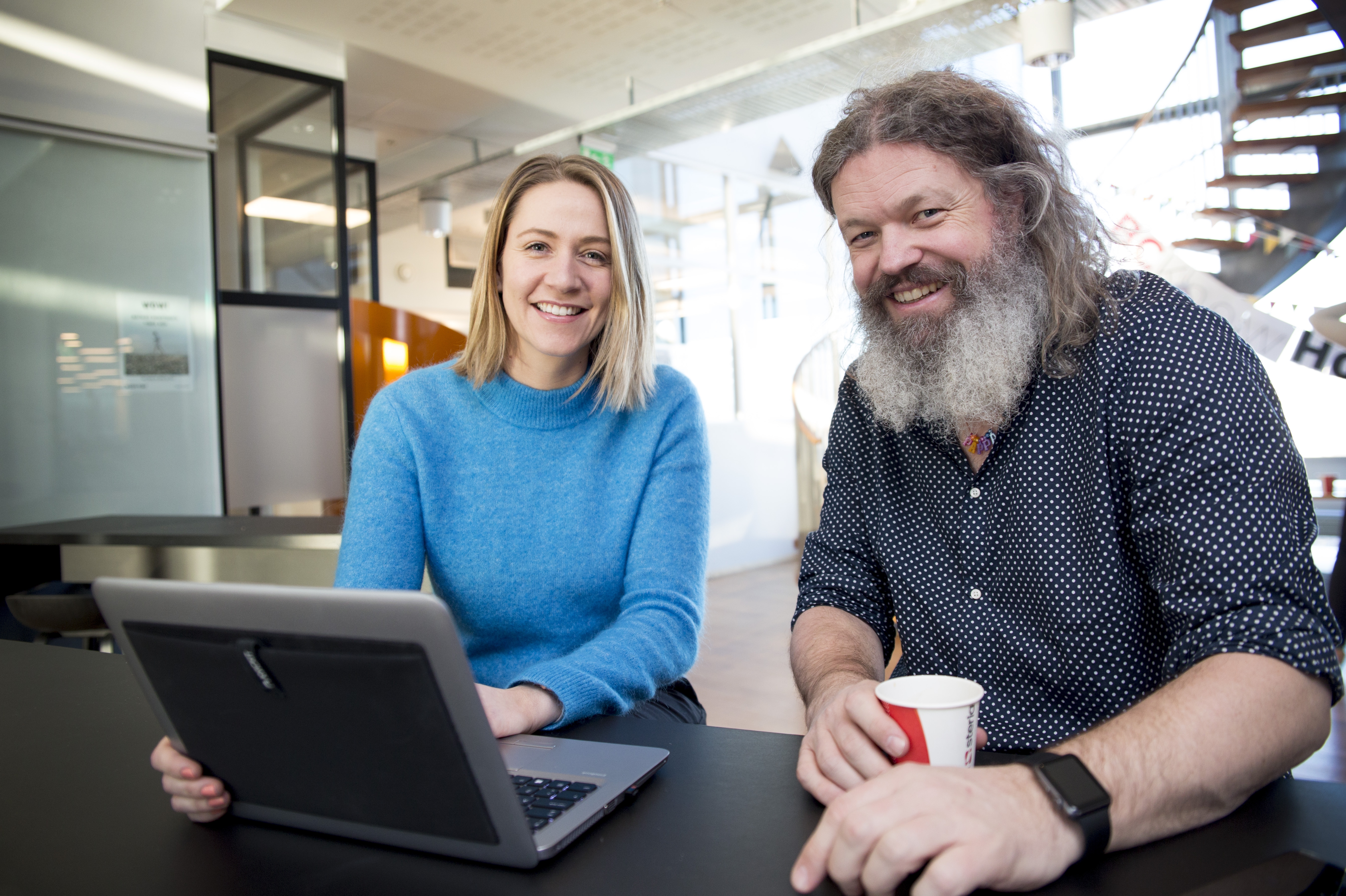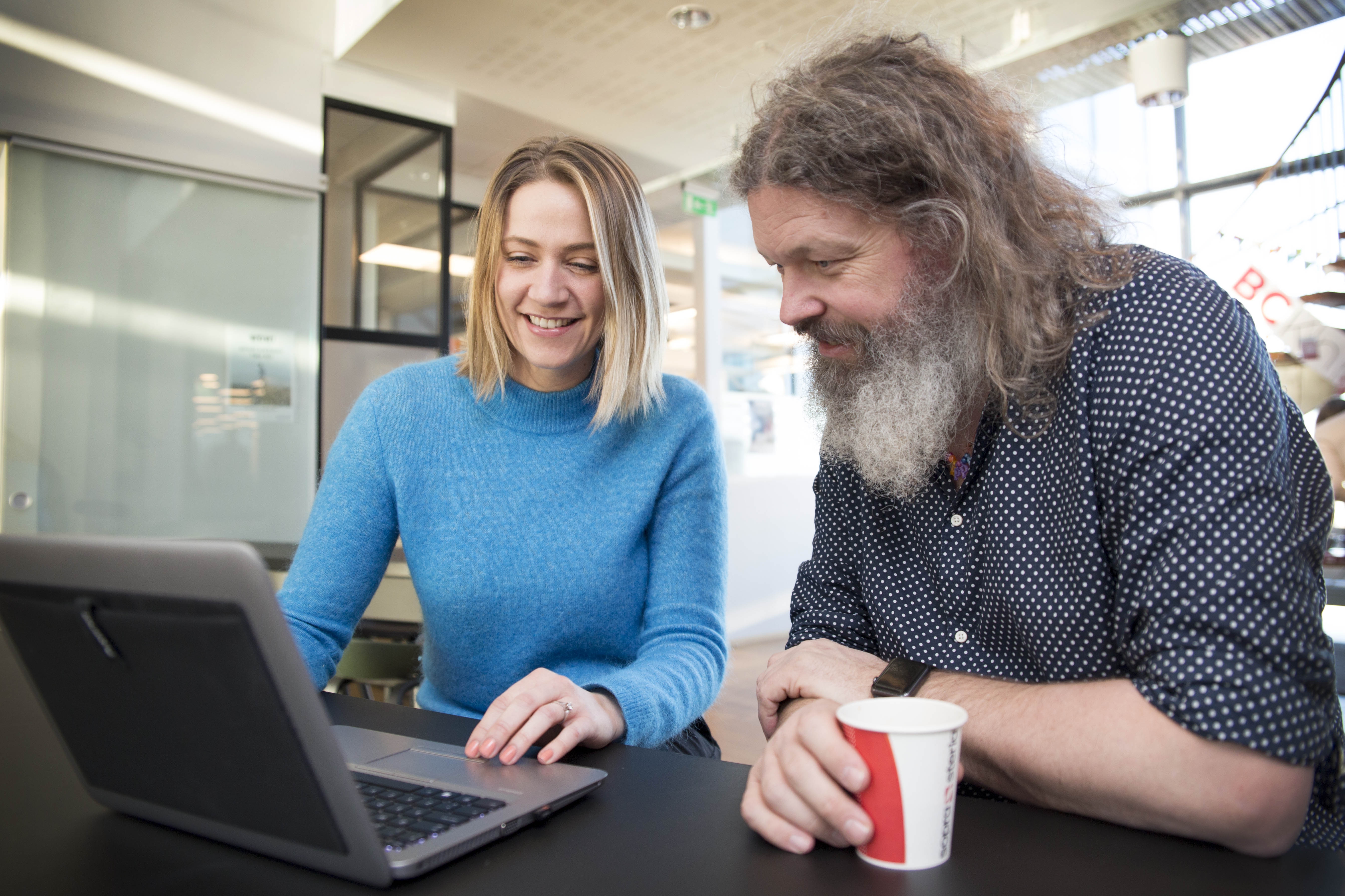 INGEN PEKEFINGER. Cathrine Singstad fra Sopra Steria og Torgeir Waterhouse i IKT-Norge og Lær Kidsa Koding vil gi 10-13-åring kunnskapen de trenger til å ta tryggere nettvalg i hverdagen. Foto: Hanne Kristine Fjellheim