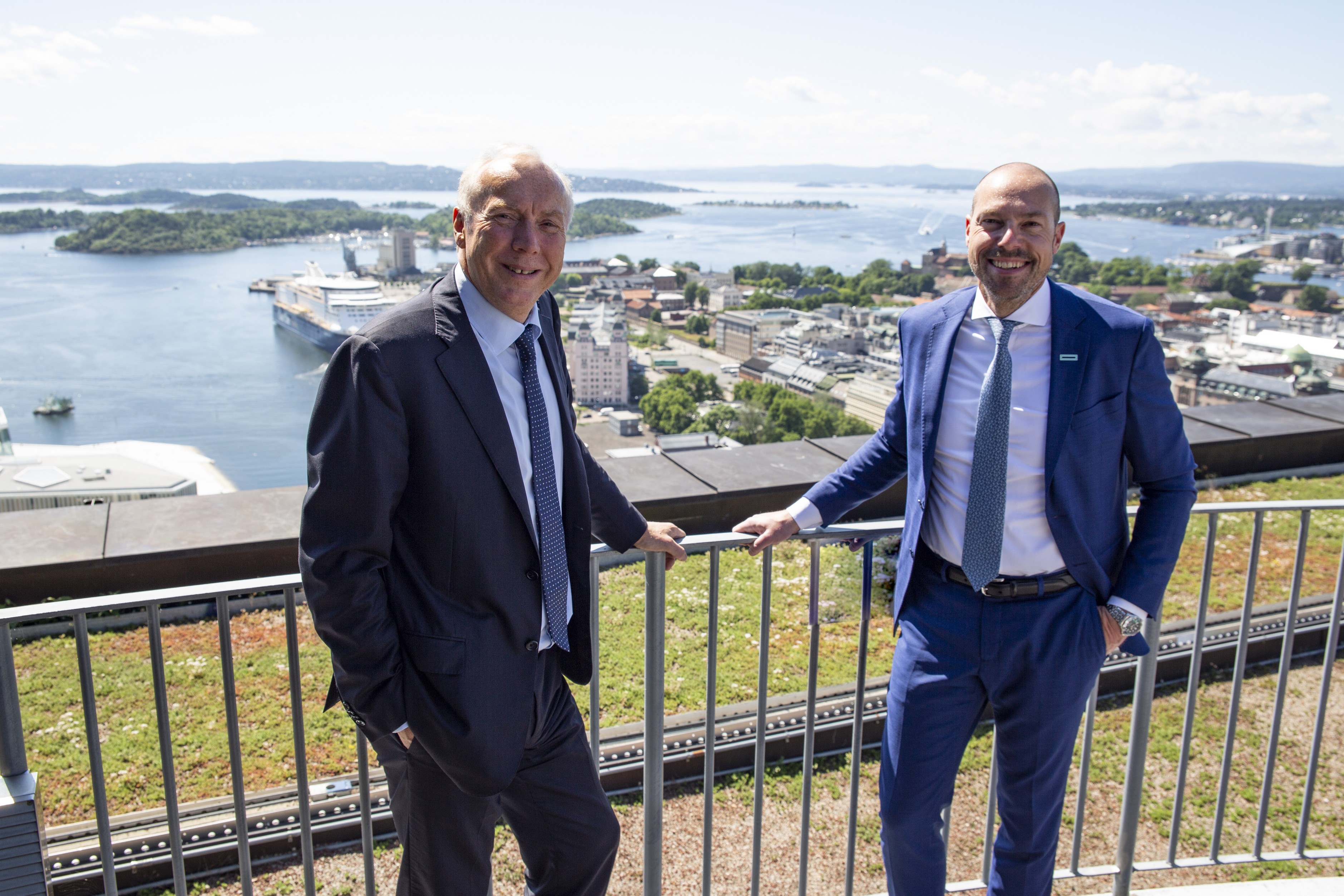 EUROPEISK PRIS. Sopra Steria Norge og administrerende direktør Kjell Rusti (t.v.) får prisen Northern Western Europe Service Provider of the Year 2021 av HPE, her ved norgessjef Thomas L. Kraft. Foto: Sopra Steria