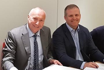 Bjørn J Villa, IT-sjef Trondheim kommune (t.h.), og Kjell Rusti, administrerende direktør i Sopra Steria Skandinavia, signerte ny driftsavtale i Trondheim 5. juli.