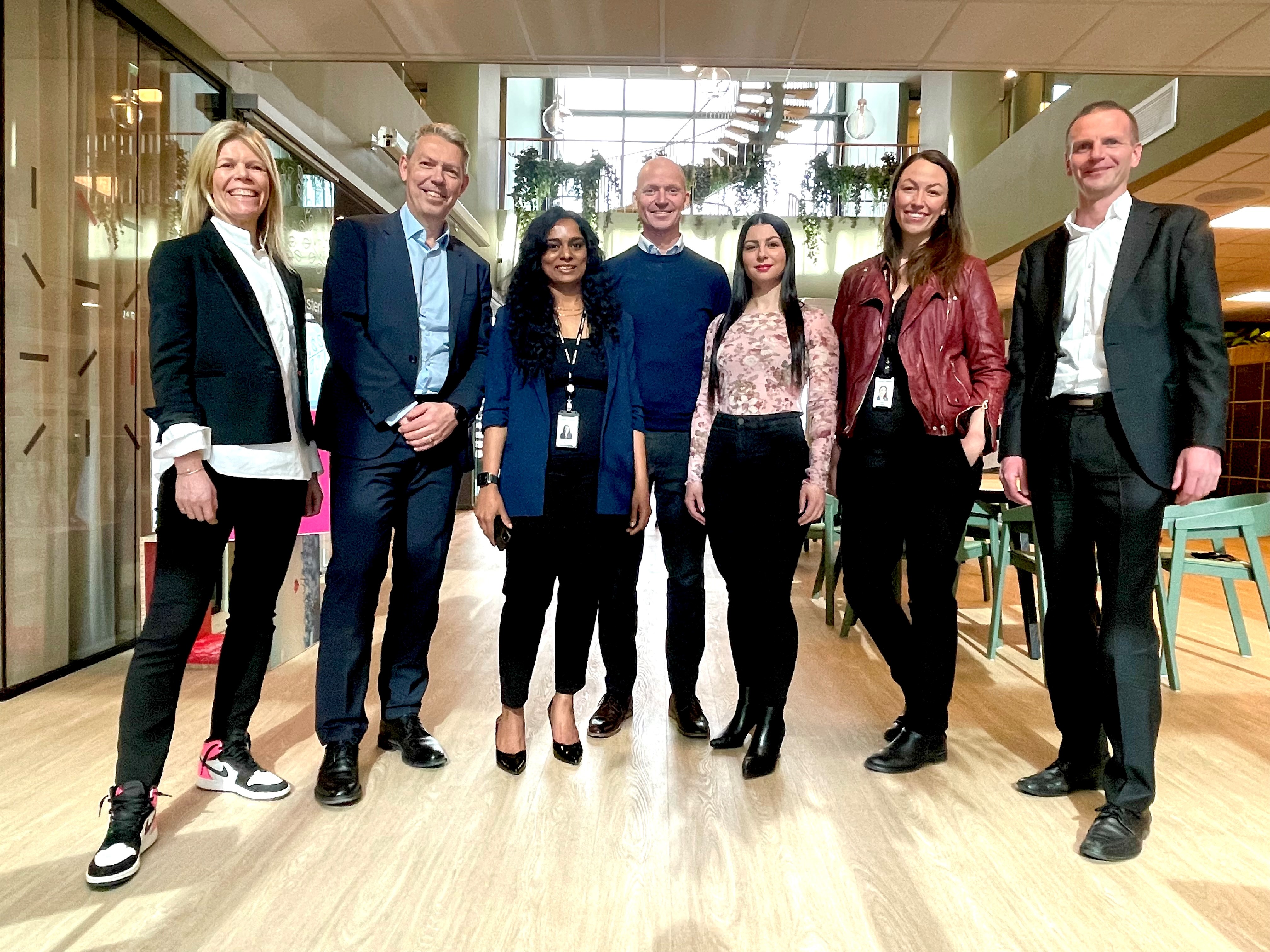 STOLT SERVICENOW-GJENG. Fra høyre, Mads Myrvoll (Director, Digital workflow), Hanne Lystad (Agency Director, Digital workflow/DPS), Gabriella Polasek (Agency Director, Digital workflow/DPS), Andreas Sinding-Larsen (Agency Director, Digital workflow/DPS), Prathiba Satish (management consultant, digital workflow/DPS), Tommy Dignes (Agency Director, Digital workflow/DPS), Mari Schrumpf (Agency Director, Digital workflow/DPS).